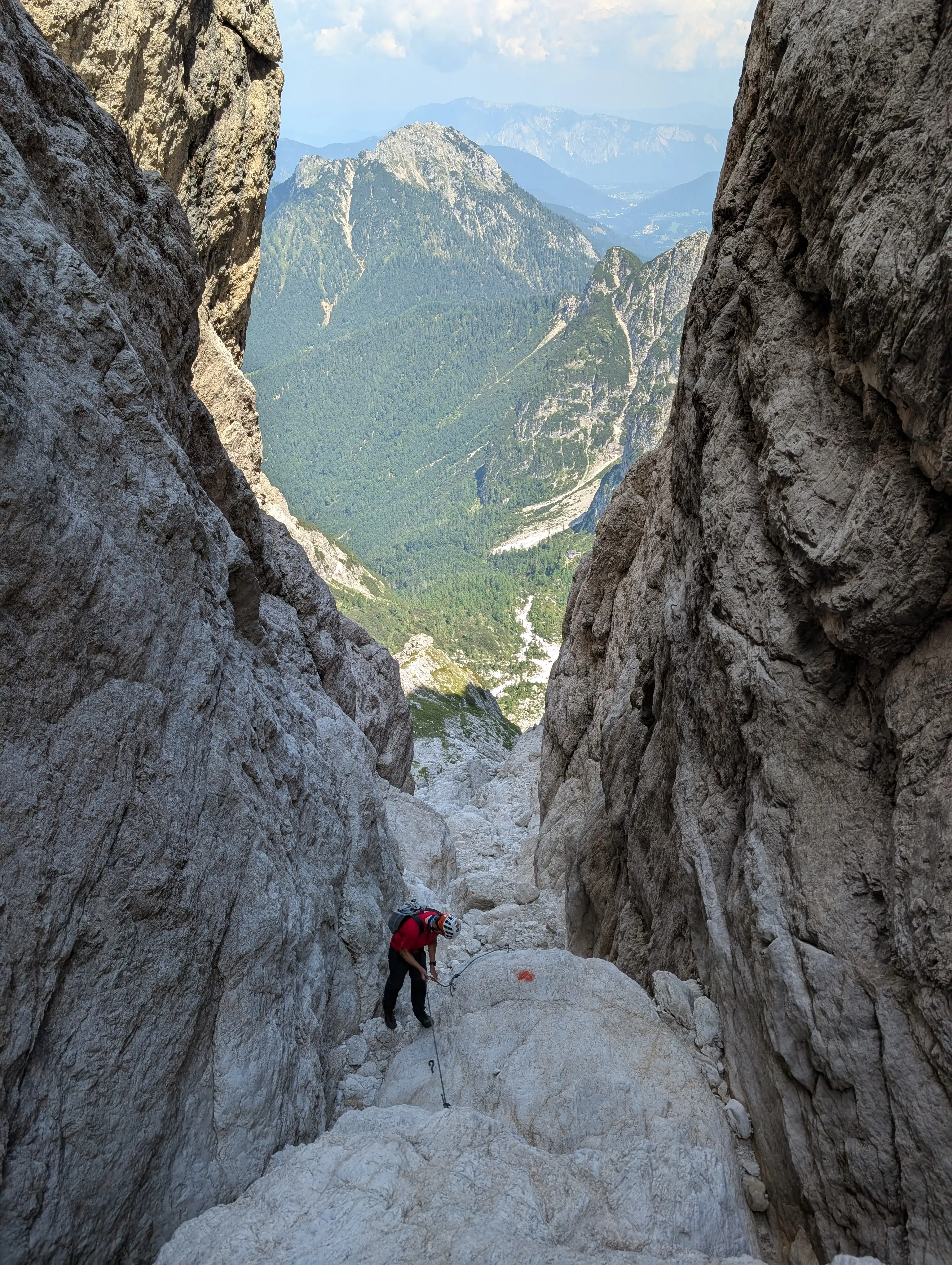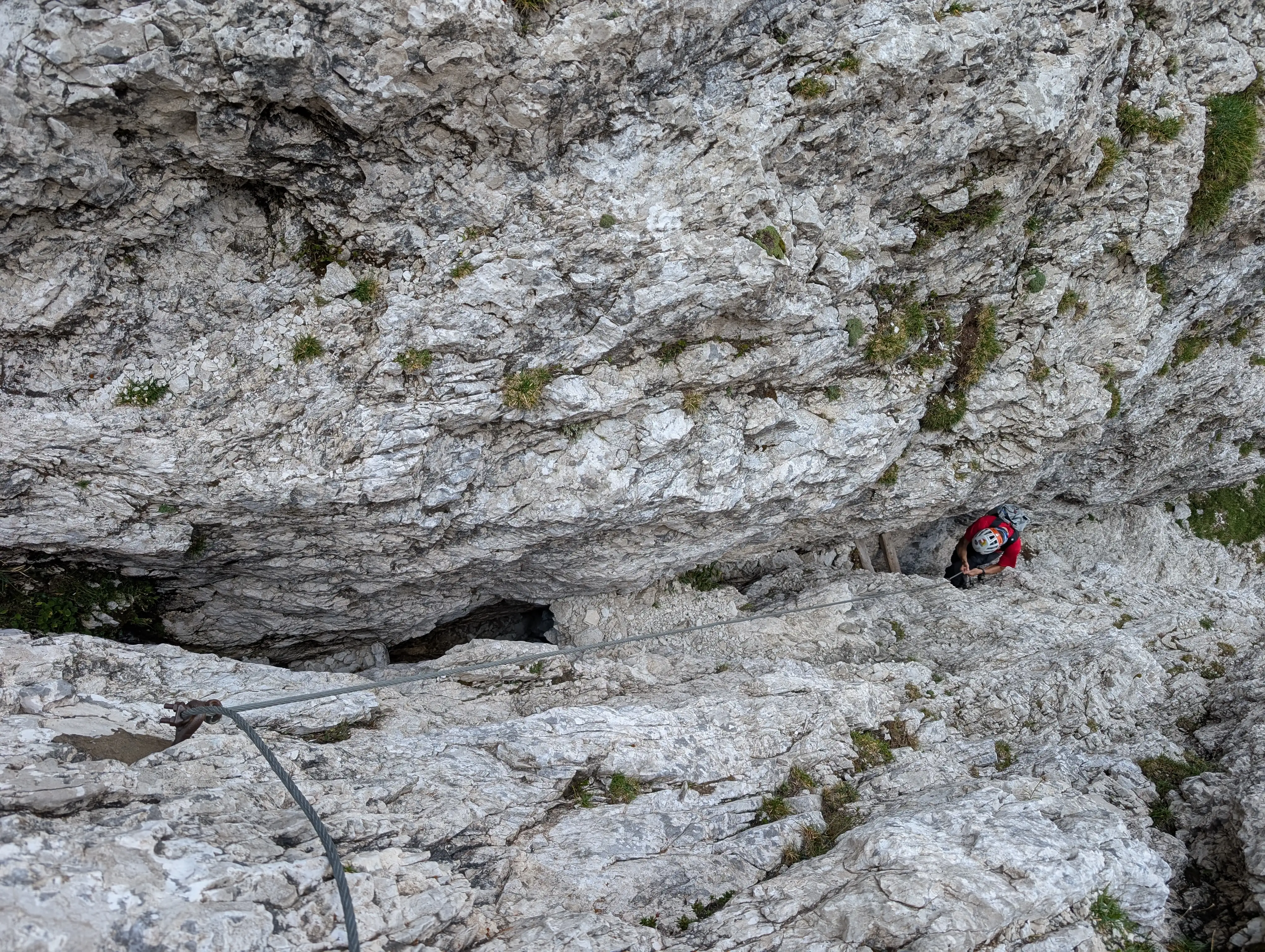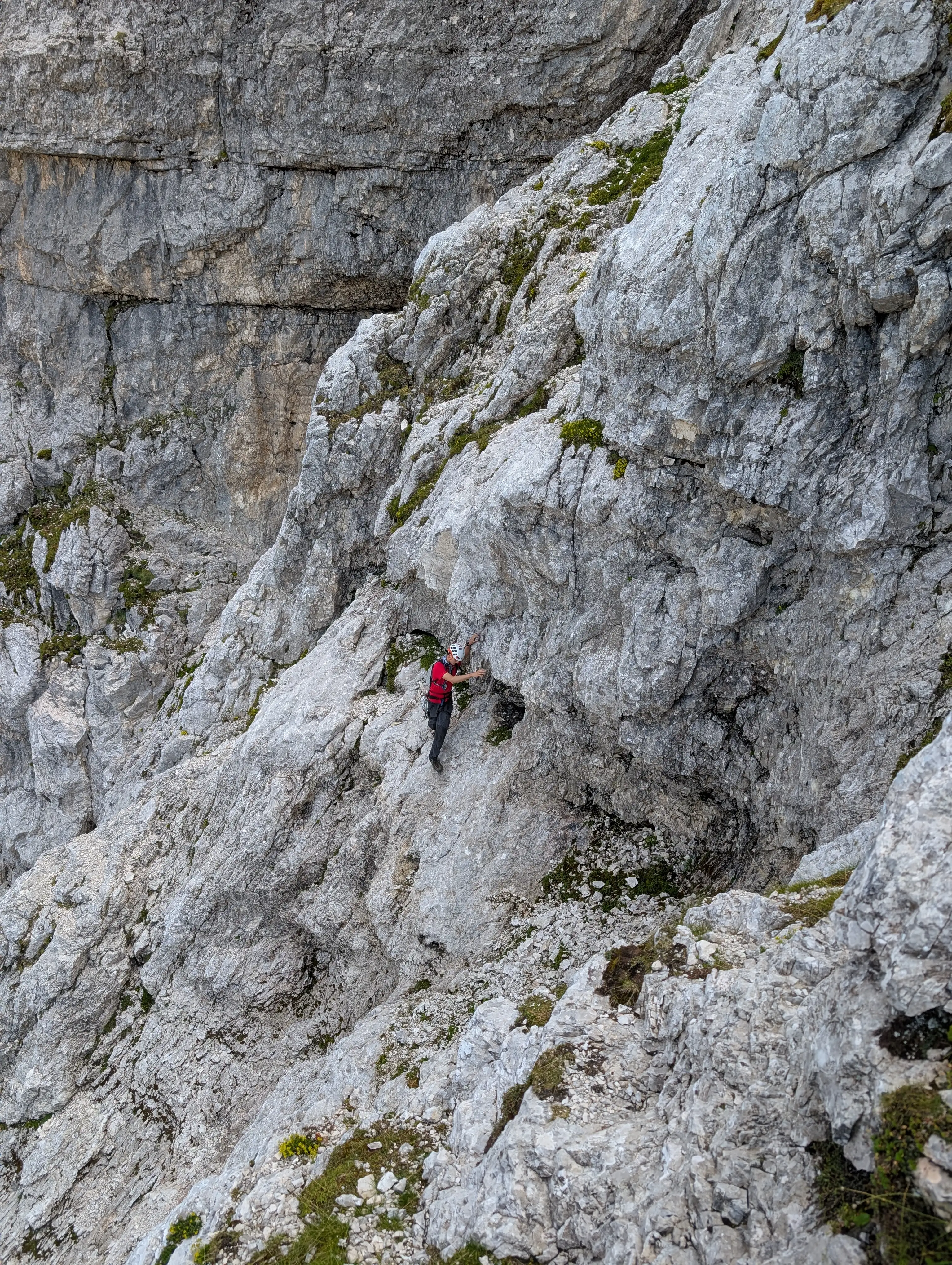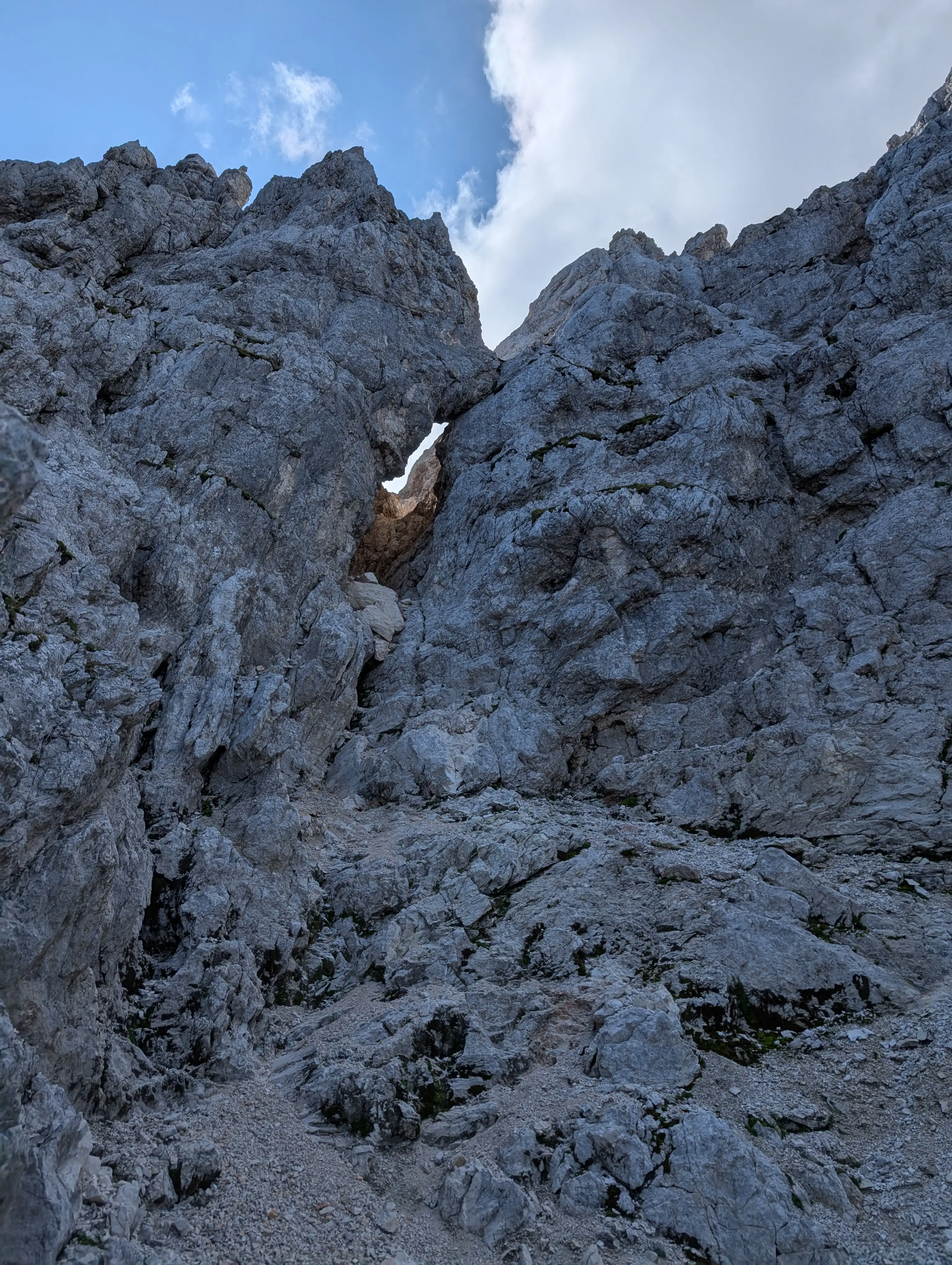 In the last sections you need to look up and aim for so called Jôf Fuart tunnel - an uncanny window that needs to be crossed to get to the ridge. Be careful in the window, there are tons of loose material inside.