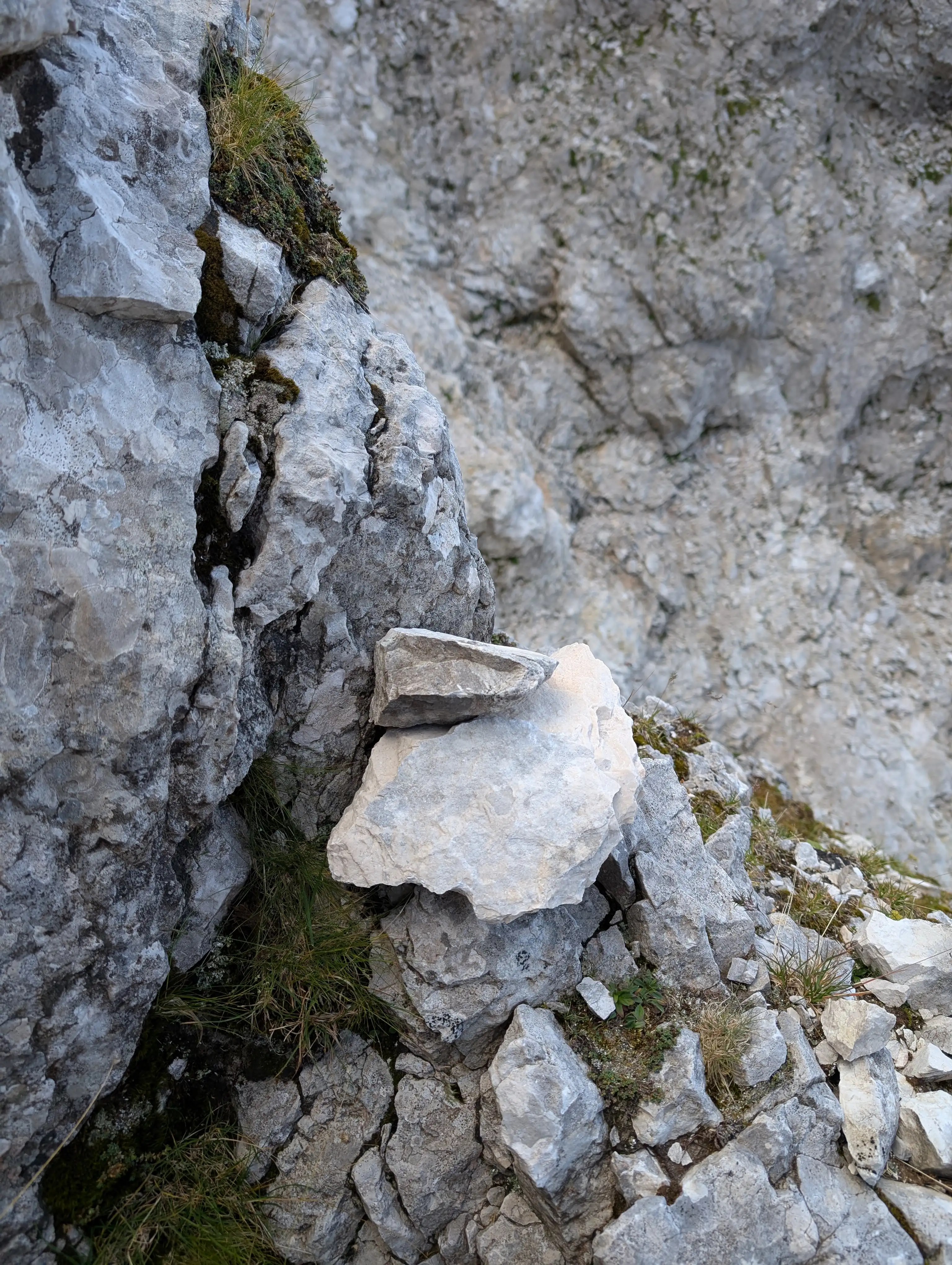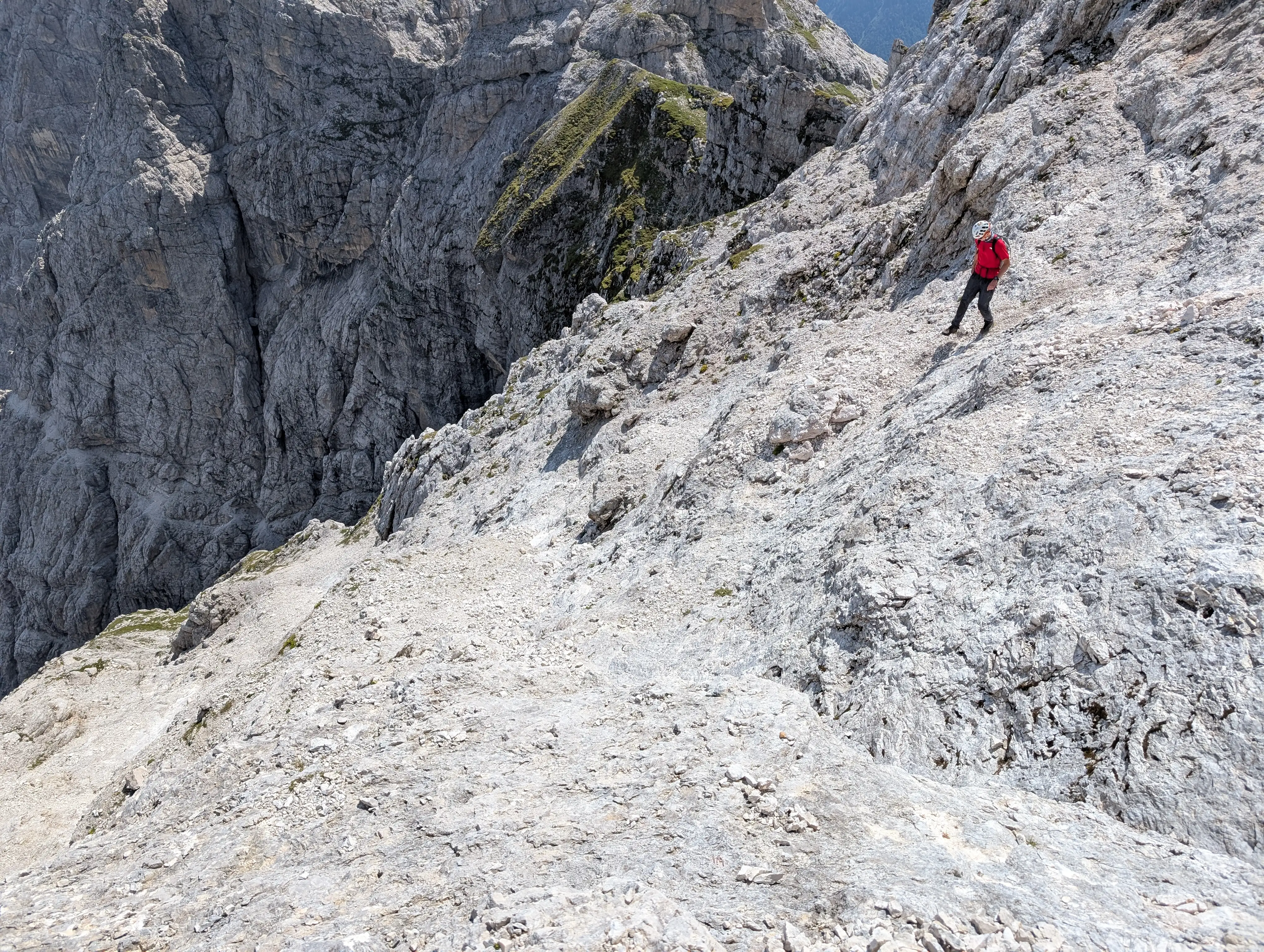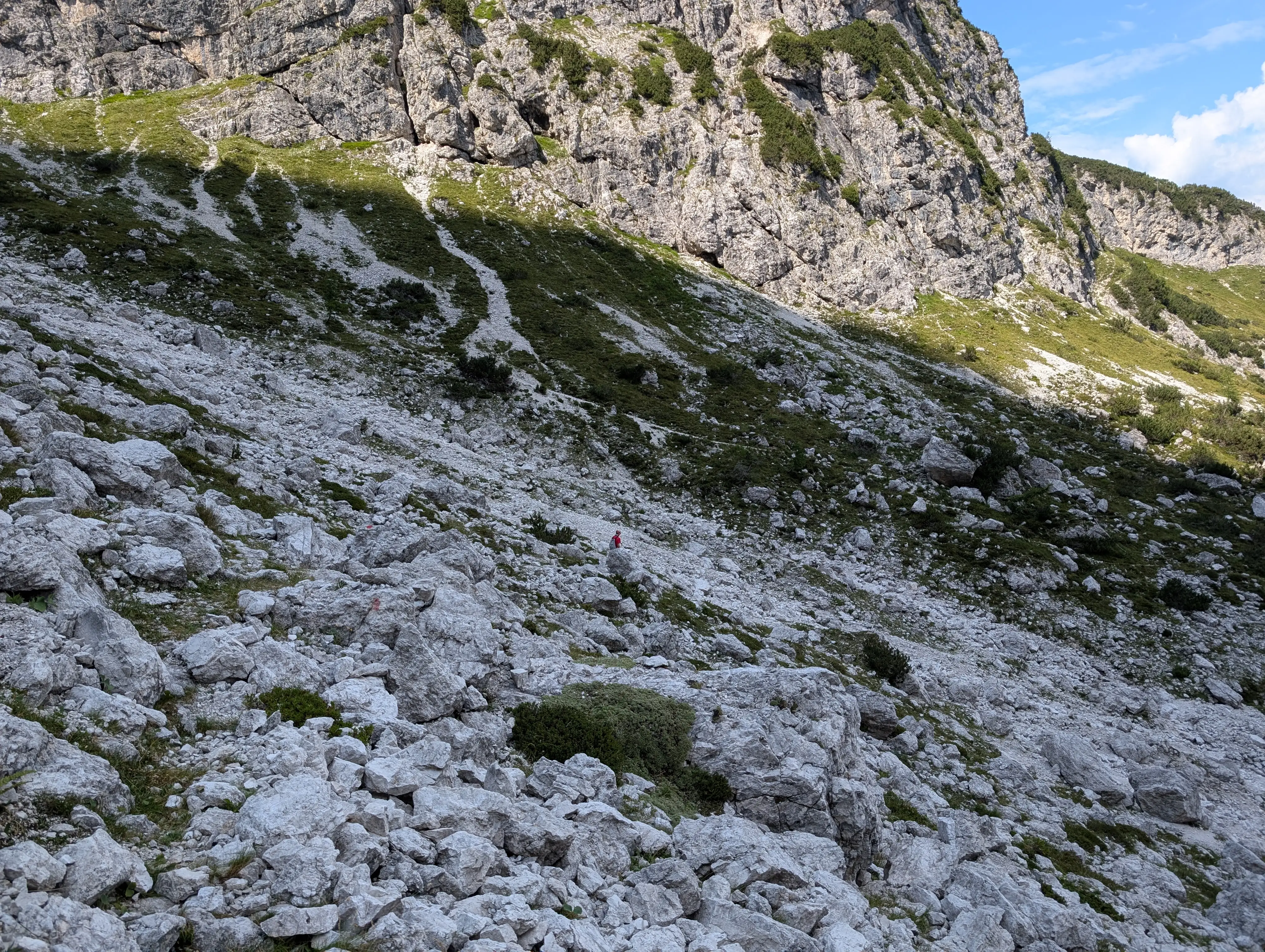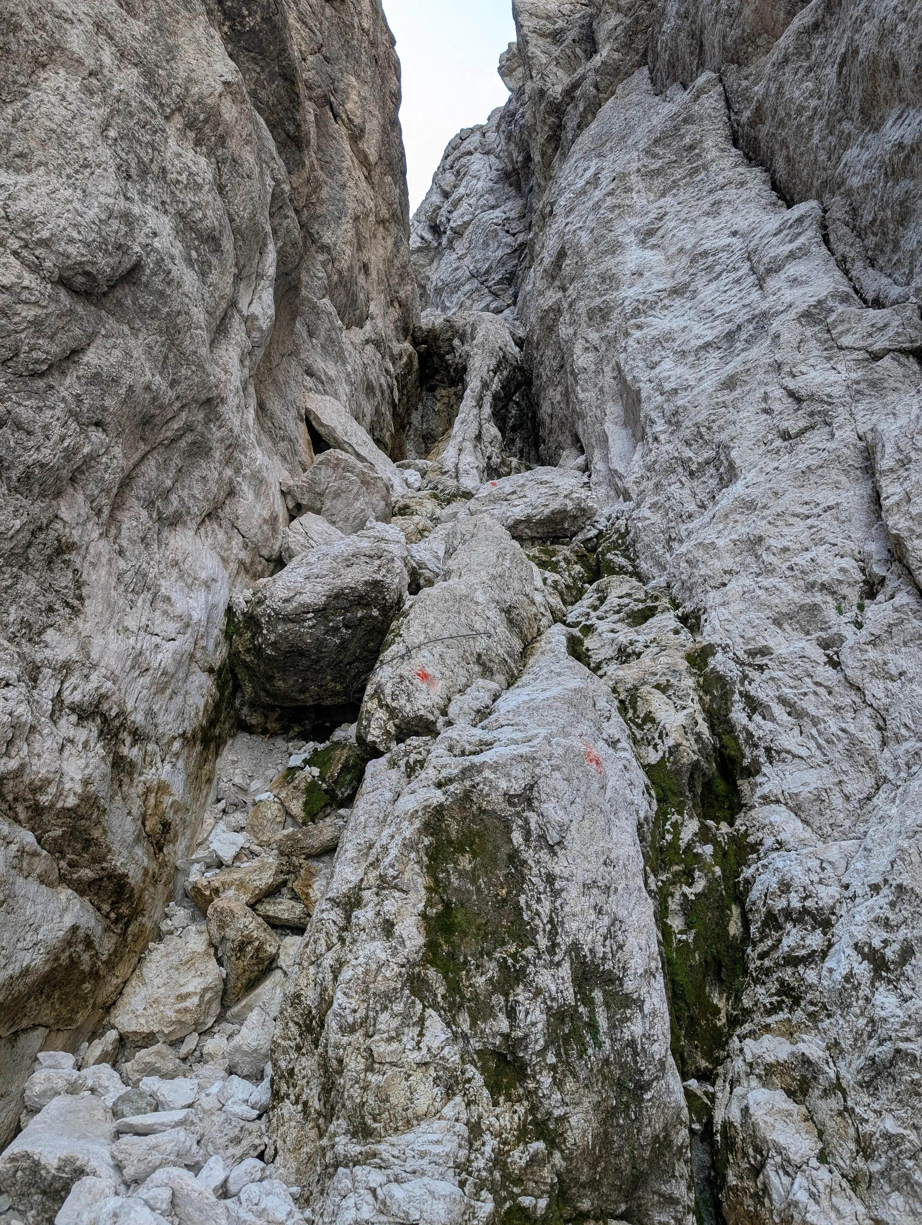 At the altitude of around 2100 just next to a snowfield there’s a rocky threshold that needs to be climbed, there are many variants, the easiest is presumably a 6m long chimney on the right side of the gorge. It is rated as III climbing grade, for me personally wasn’t really that pleasant. You can try other spots but these may be more difficult. Just above this threshold the route crosses Cengia degli Dei (ledge of the gods in English) route - which is a ledge system running around the Jôf Fuart massif. There are cairns in place that can lead you off the route - which happened to me. Against intuition you need to follow the gorge keeping more to the left in here landing under what seems a vertical wall - according to the descriptions I read before setting off there is a hidden passage. However my case showed it can also be by-passed from above - so first going a bit right along Cengia degli Dei and then traversing back in the direction of the gorge. Except for the mentioned rocky threshold climbing difficulty does not exceed II+ grade. However that is dependent on the variant you choose so keep a good eye on the way up.