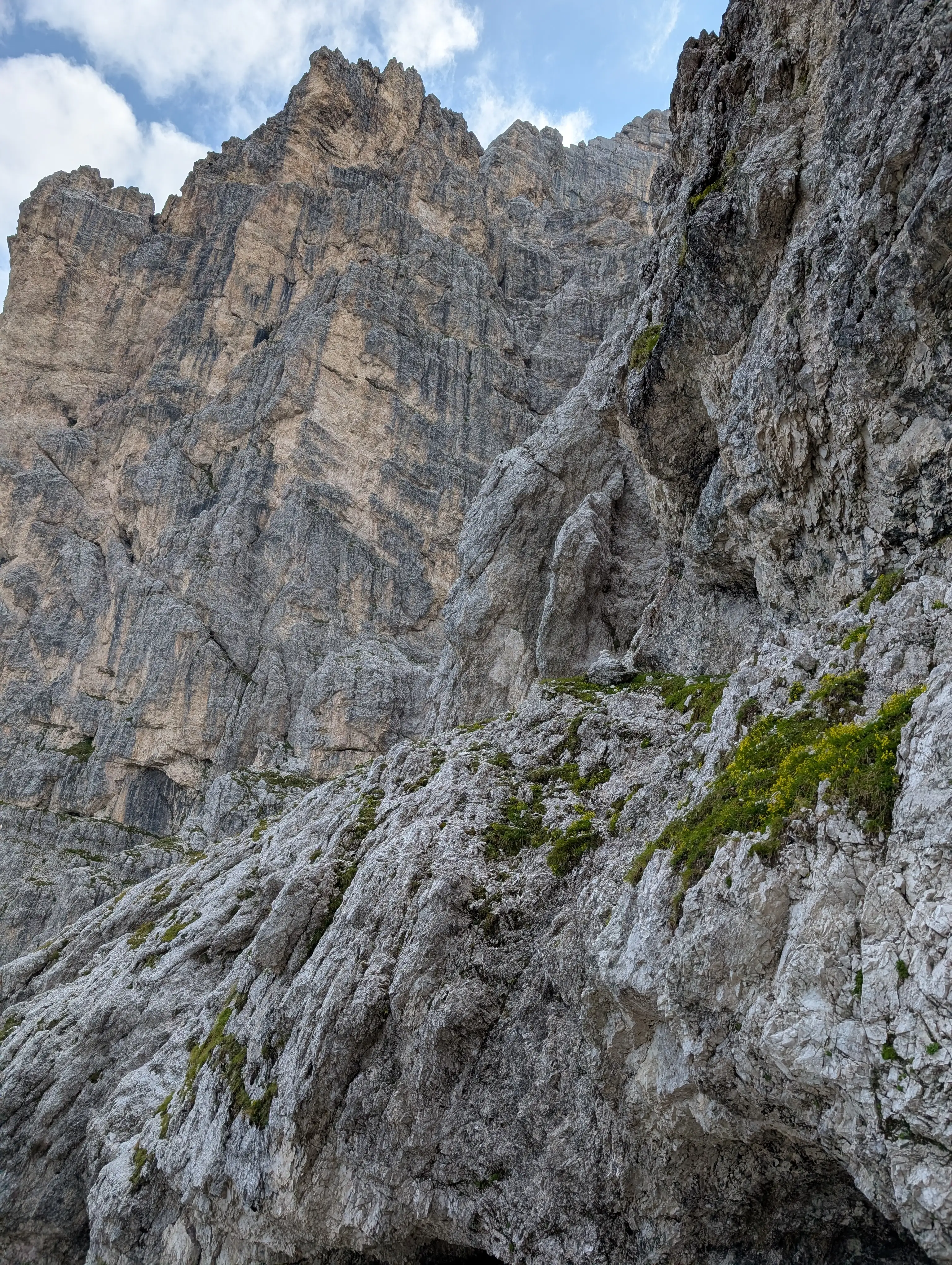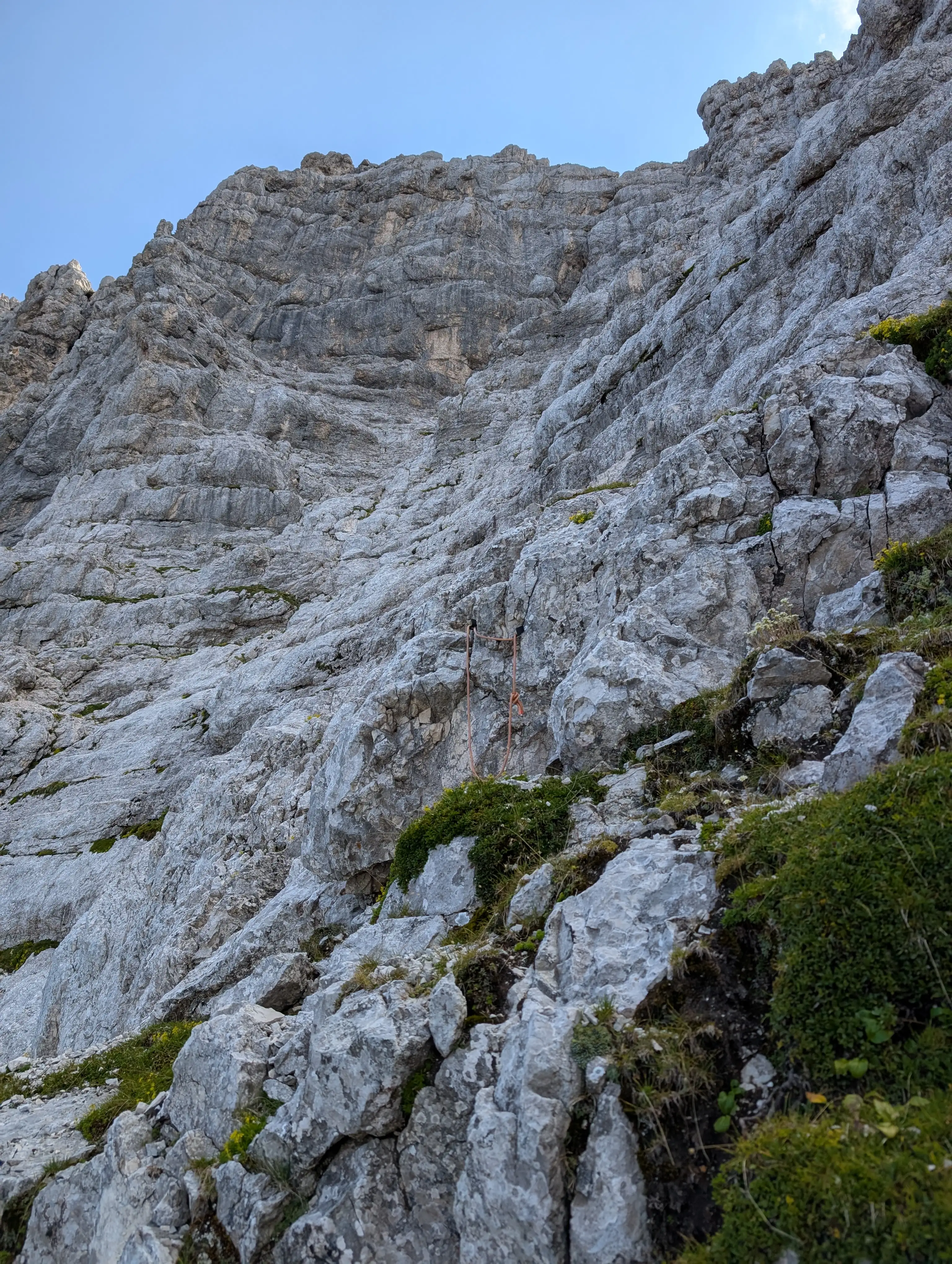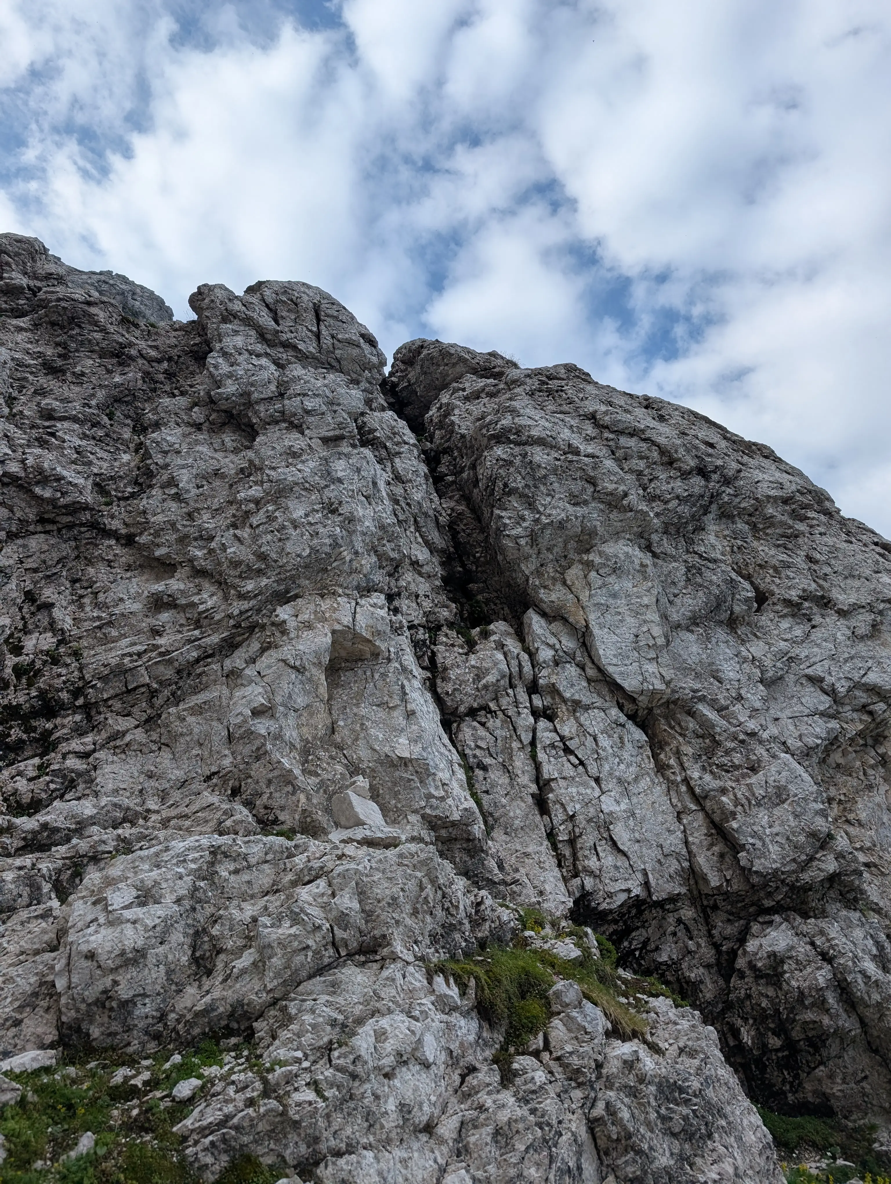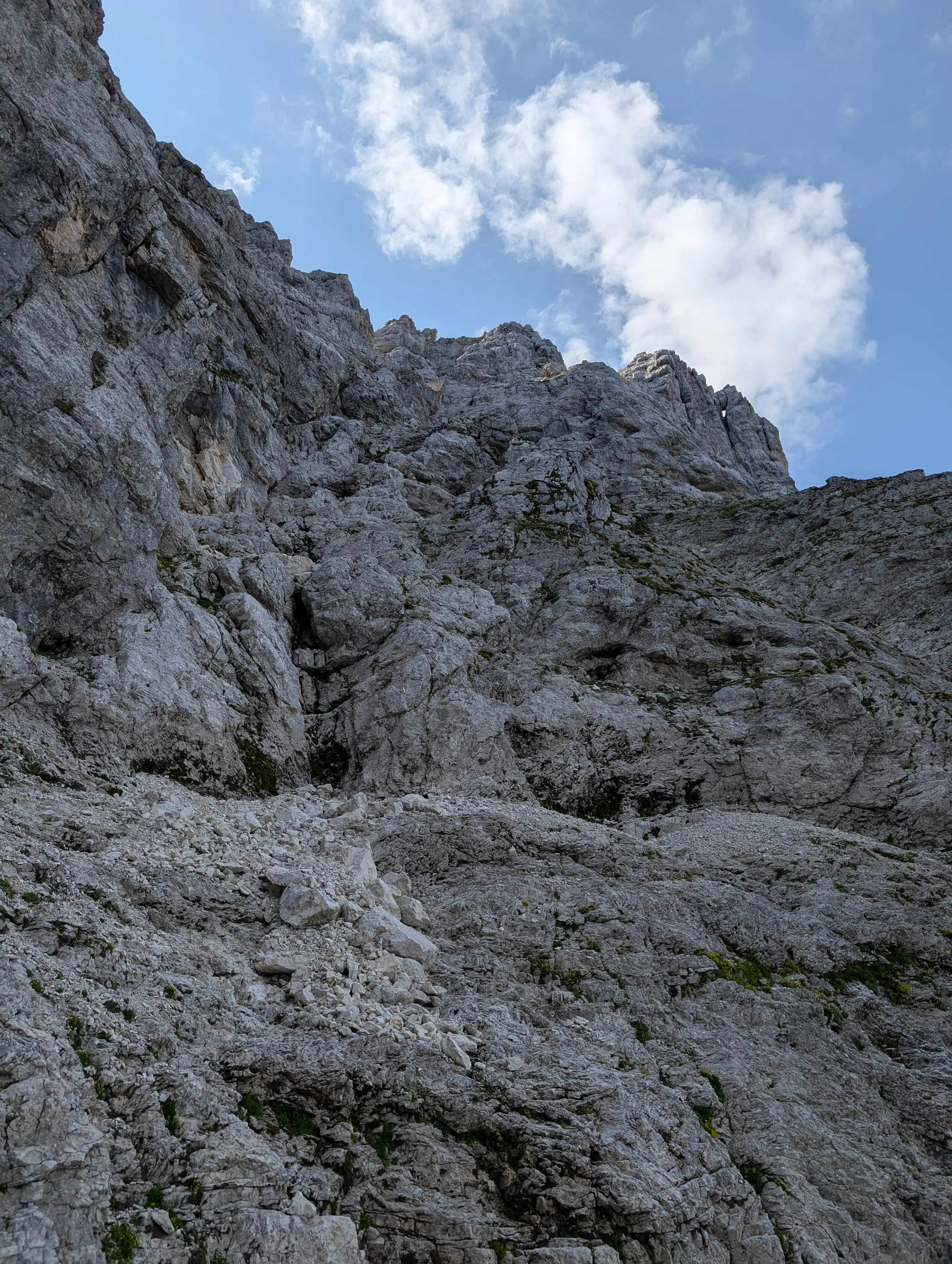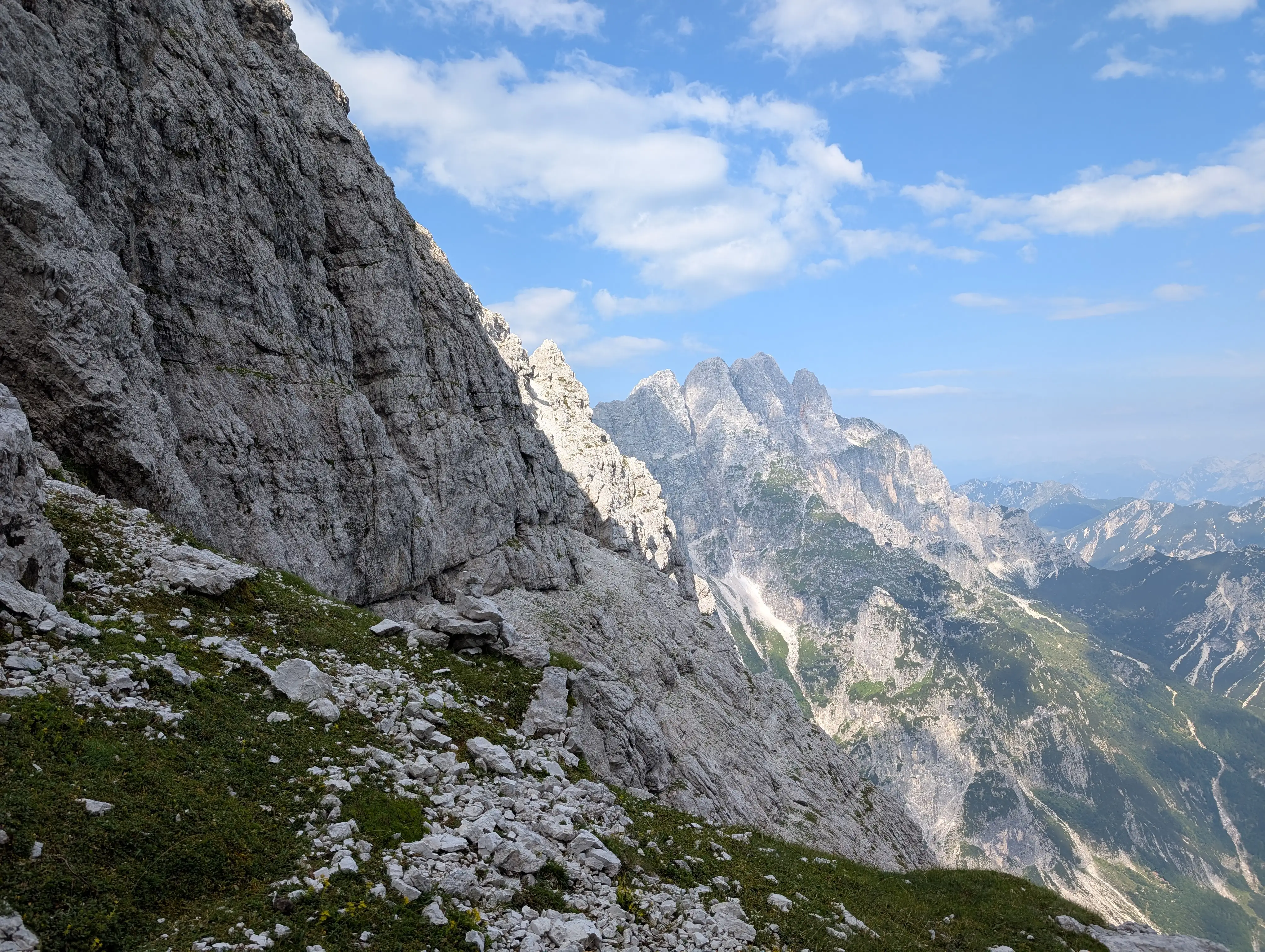 At the altitude of around 2100 just next to a snowfield there’s a rocky threshold that needs to be climbed, there are many variants, the easiest is presumably a 6m long chimney on the right side of the gorge. It is rated as III climbing grade, for me personally wasn’t really that pleasant. You can try other spots but these may be more difficult. Just above this threshold the route crosses Cengia degli Dei (ledge of the gods in English) route - which is a ledge system running around the Jôf Fuart massif. There are cairns in place that can lead you off the route - which happened to me. Against intuition you need to follow the gorge keeping more to the left in here landing under what seems a vertical wall - according to the descriptions I read before setting off there is a hidden passage. However my case showed it can also be by-passed from above - so first going a bit right along Cengia degli Dei and then traversing back in the direction of the gorge. Except for the mentioned rocky threshold climbing difficulty does not exceed II+ grade. However that is dependent on the variant you choose so keep a good eye on the way up.