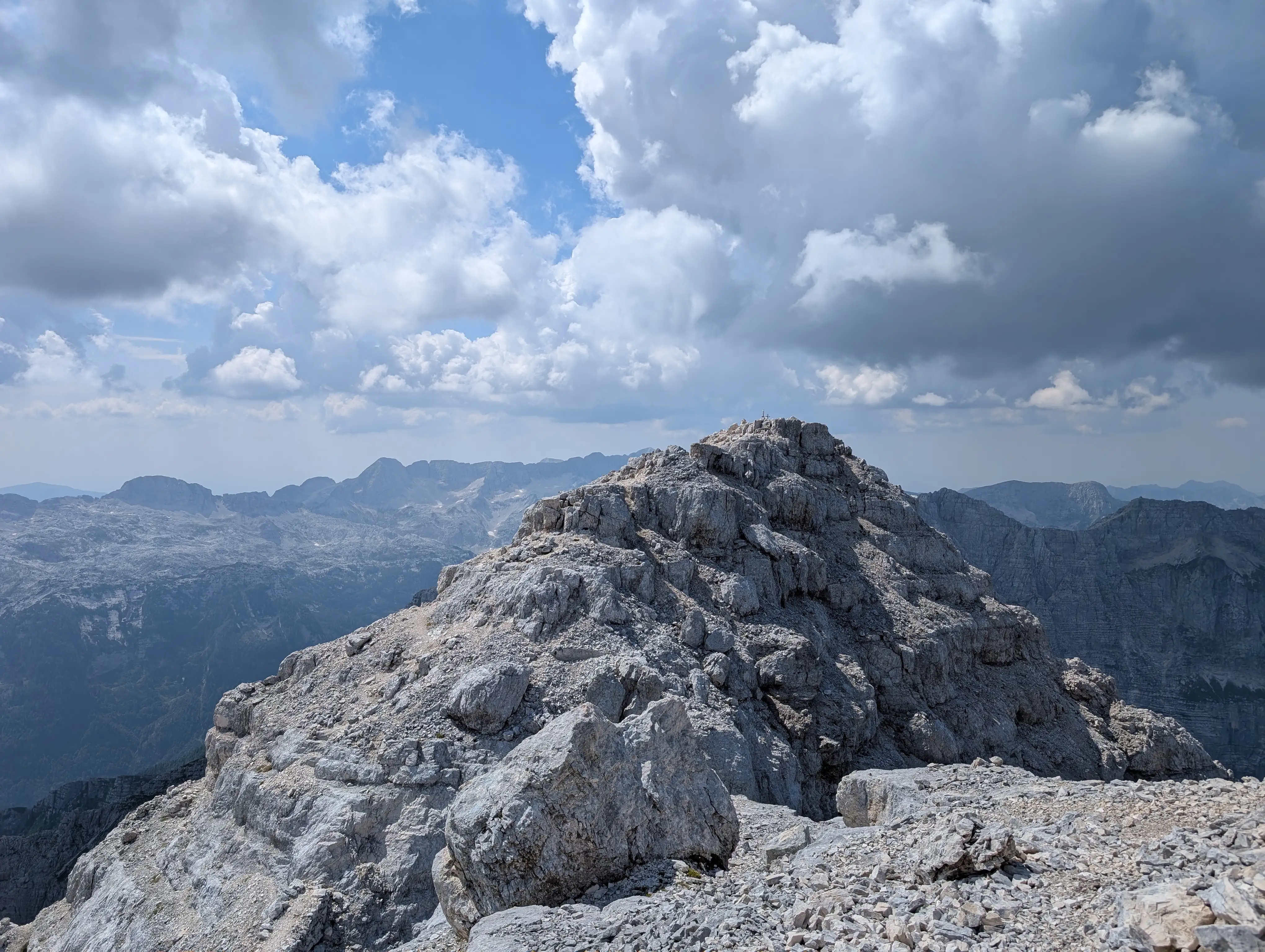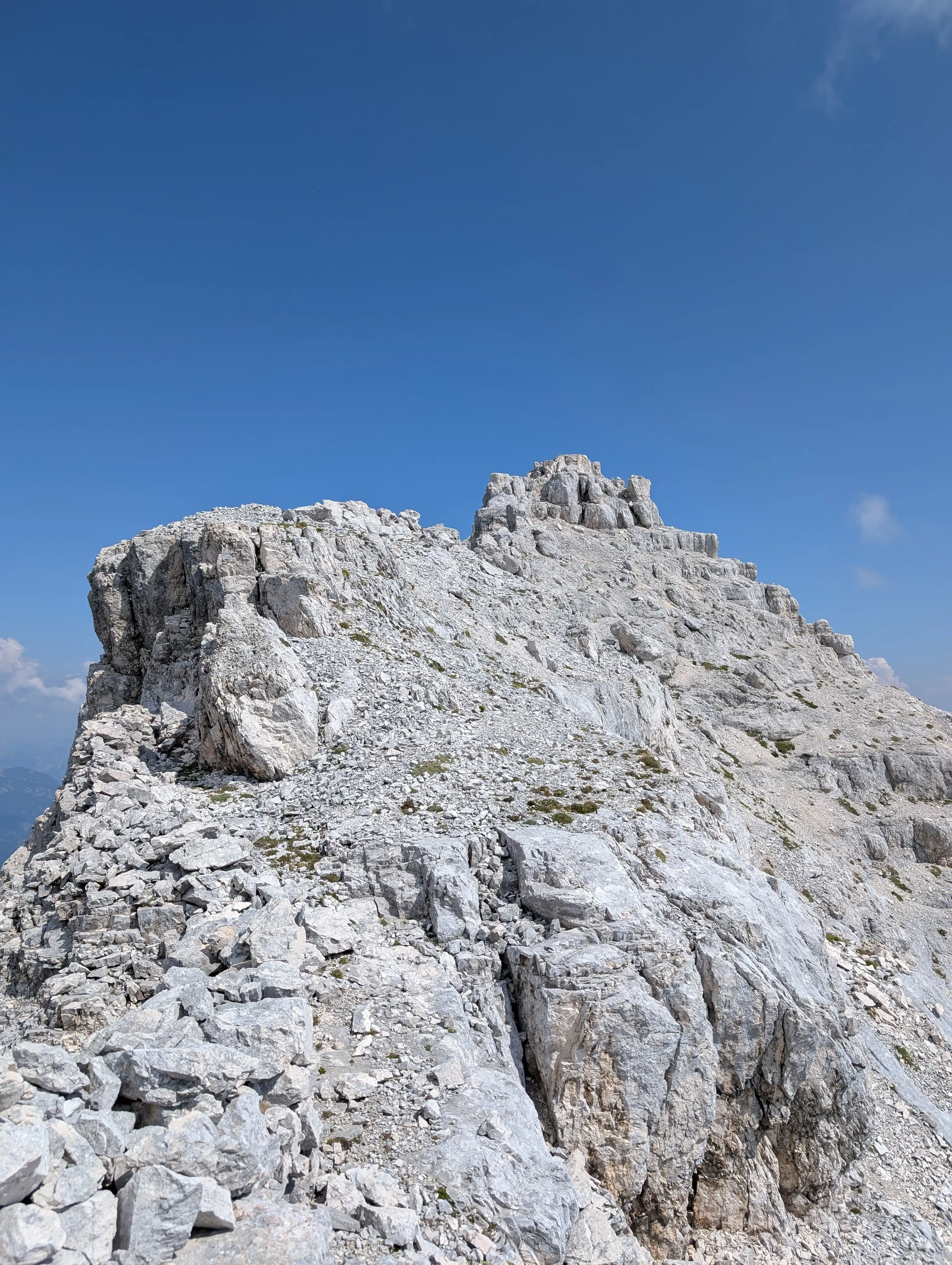 Once entering the ridge (and sun again) we turn left and use the ledges to climb flat towers. Summit can already be seen from here. In 15 minutes we land on the peak of Jôf Fuart with cross and statue of Madonna, however that is a pre-summit and we still need to walk a bit to get to the actual one.