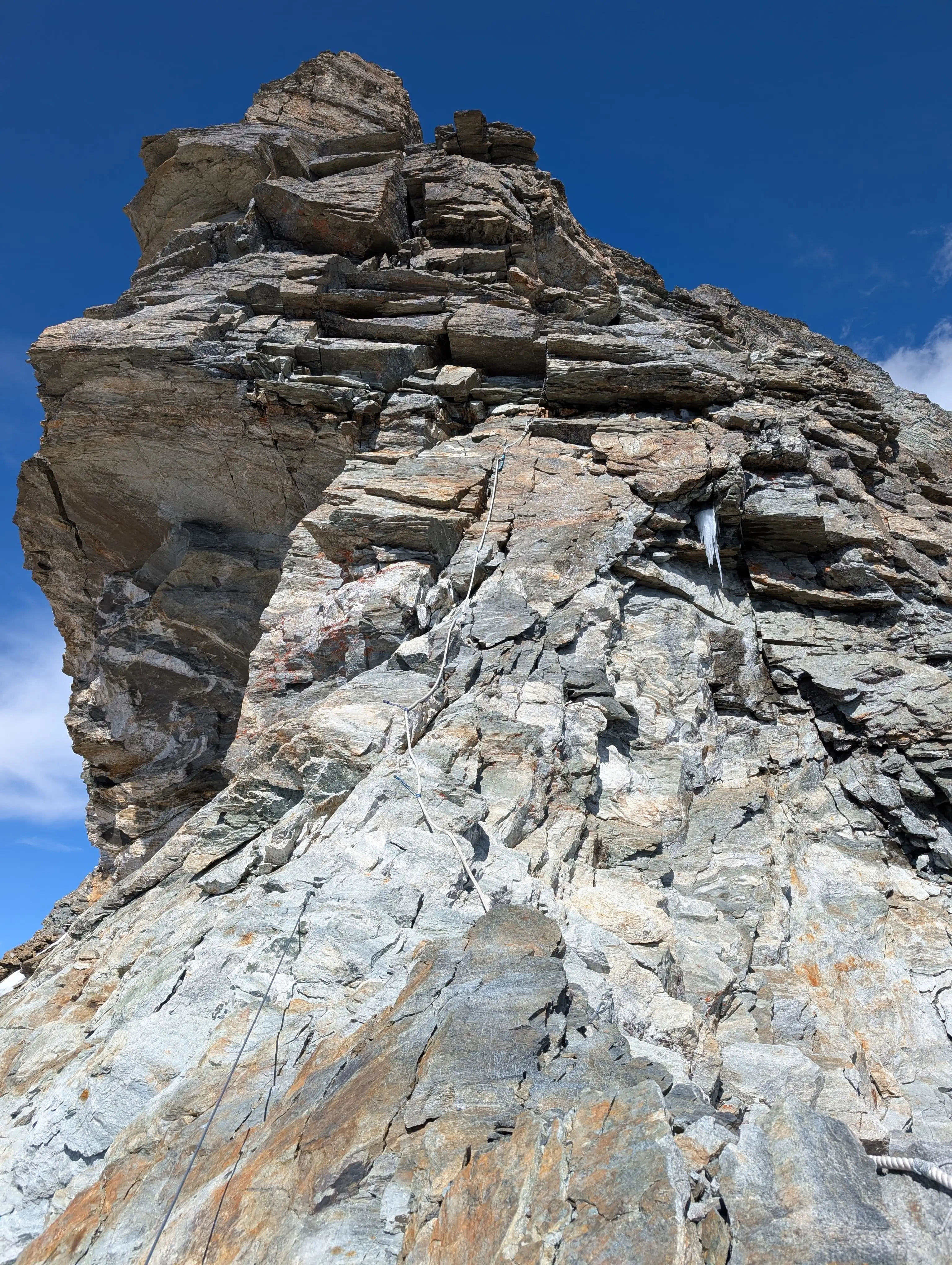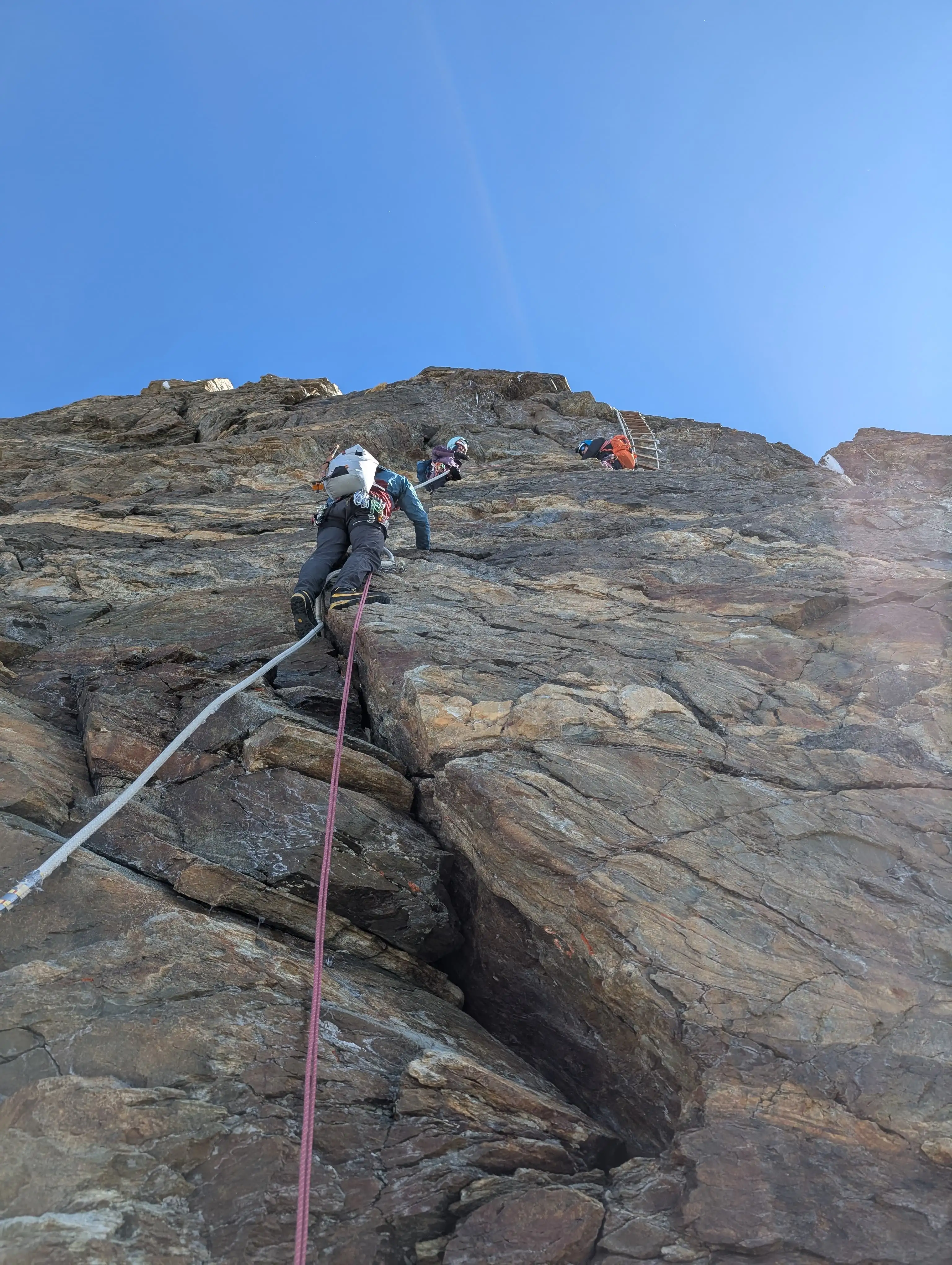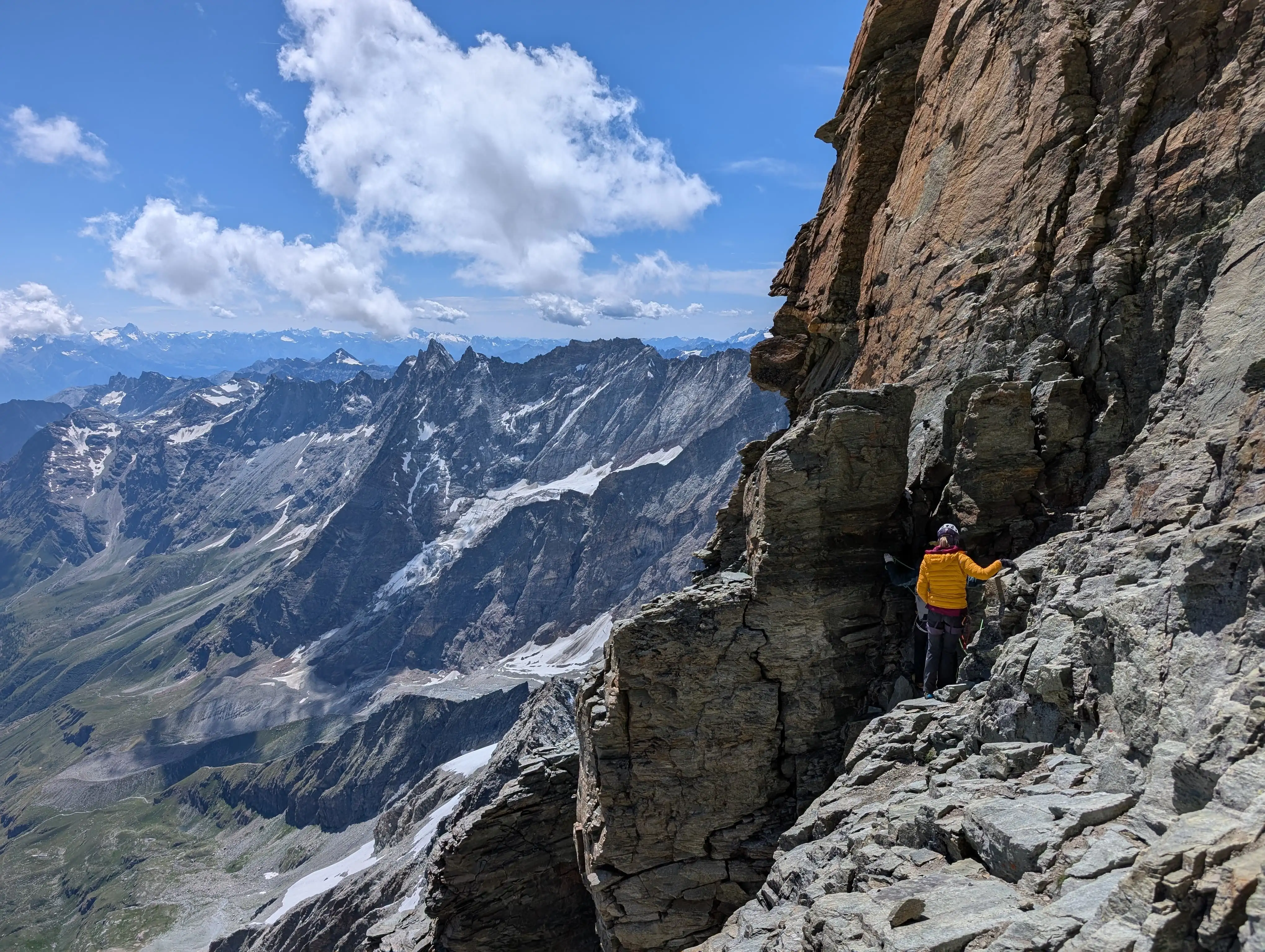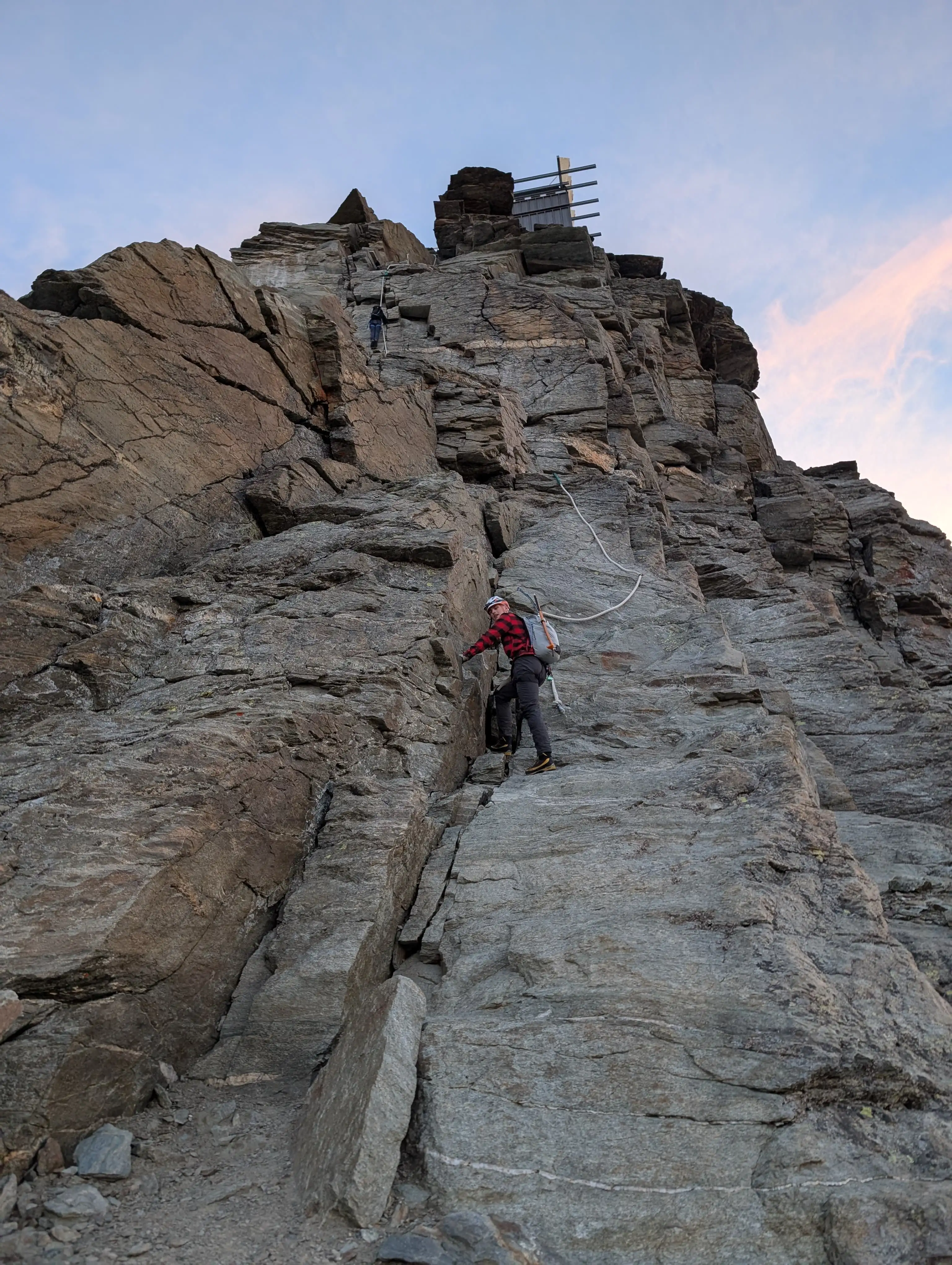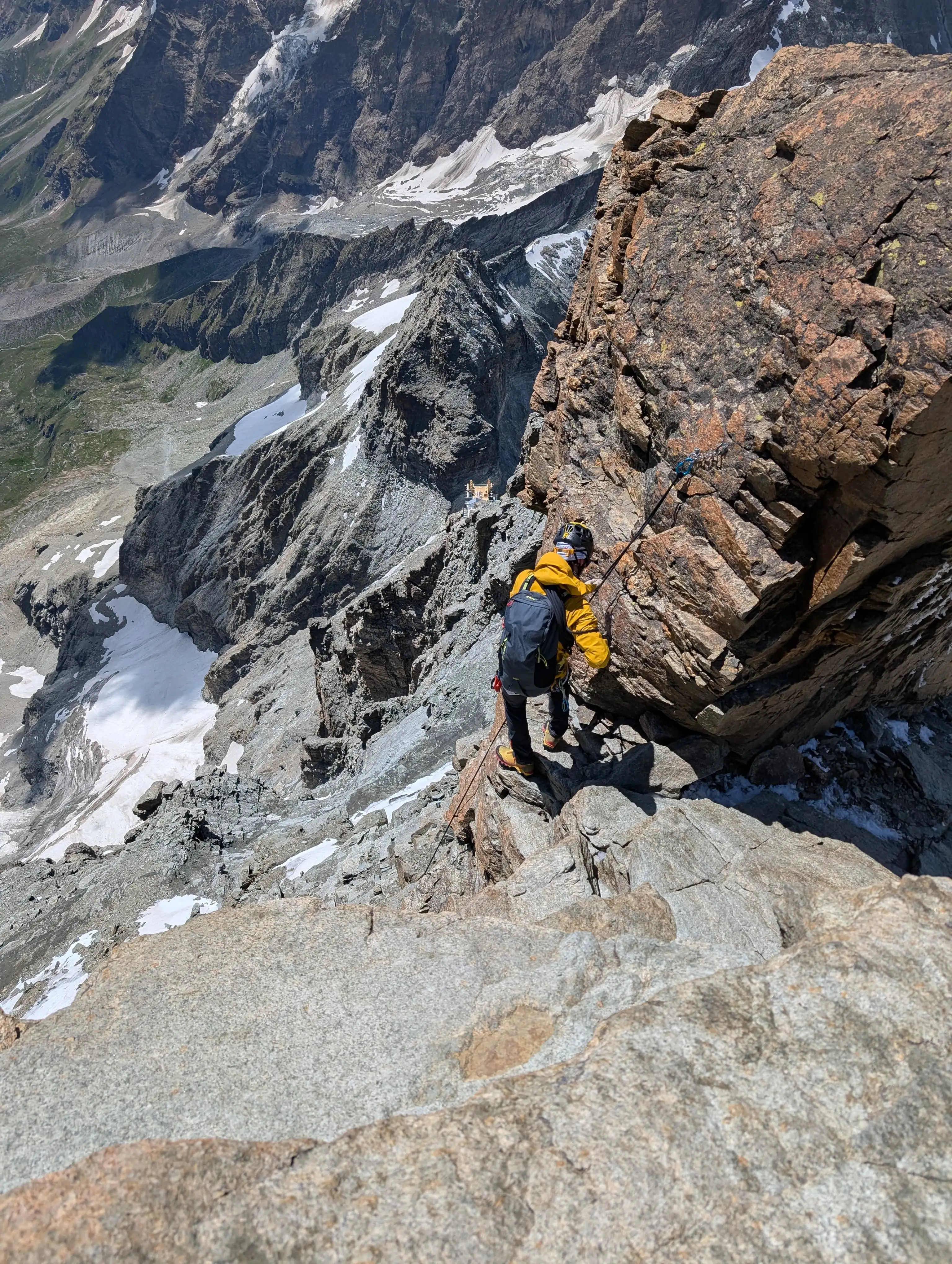 During our climb the Carrel bivouac was under renovation, estimated time for reopening is 2026. We passed the building from the left side. Now the main climb begins, first we use chains to ascend to the right of the big tower above the bivouac, next we continue the traverse on the right side (pleasurable !), climb up again, traverse with via-ferrata like cables and finally approach serie of chains that take us the ridge (chains are quite vertical). Now the difficulties ease off a bit and we follow the ridge line (directly or sometimes by-pass on the western, left side) up to Pic Tyndall (4241 m) peak. There is a serie of towers that we need to cross and down-climb - they are not that difficult and have lots of good, firm holds to support us. We don’t really descent much in terms of losing elevation. Rappelling is also an option in here, there are fixed bolts for that.
