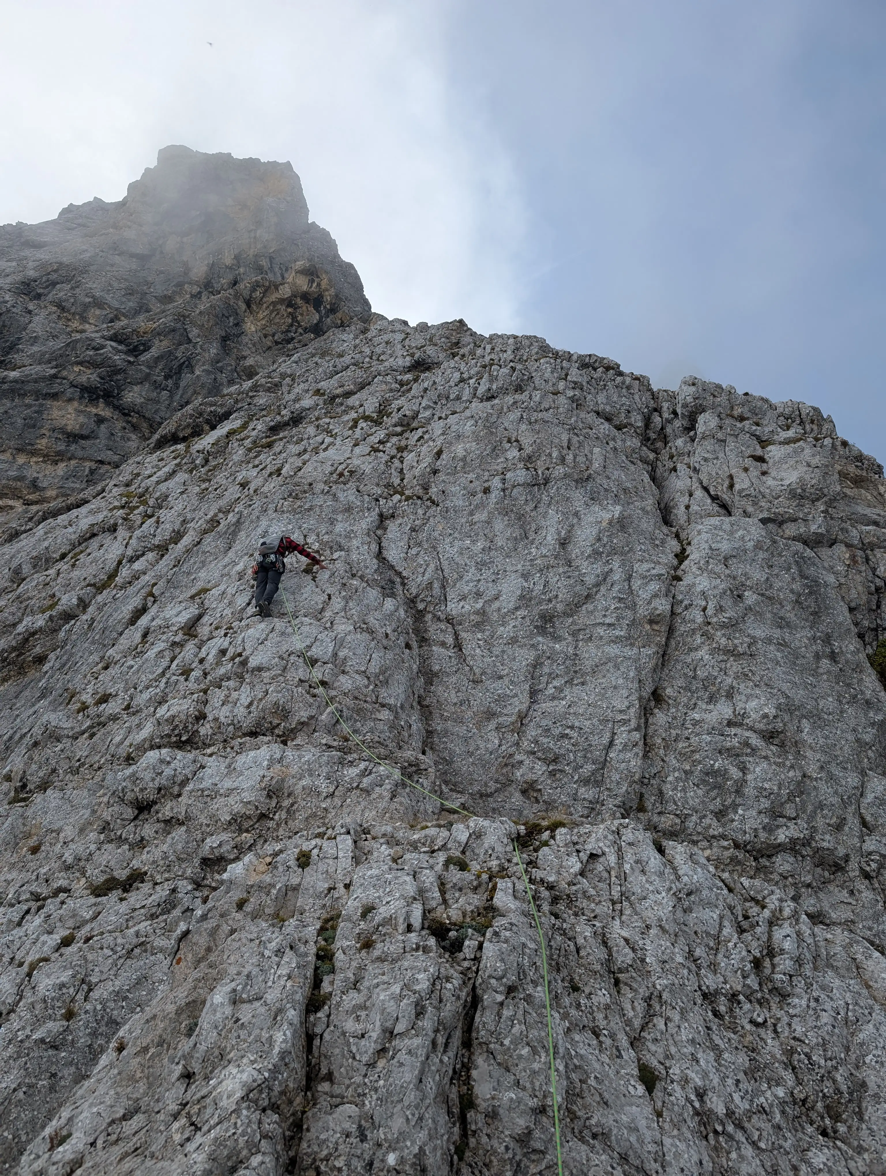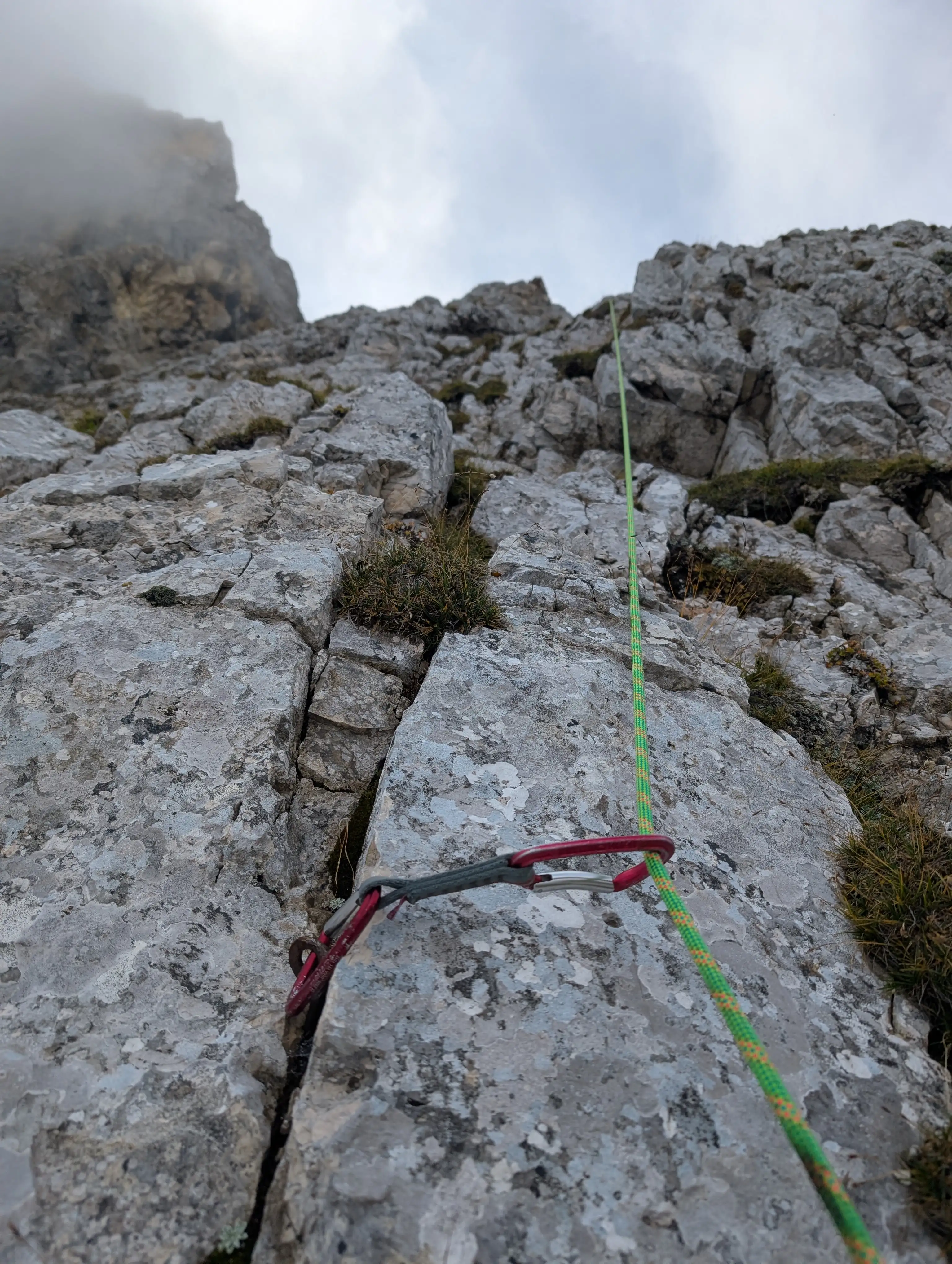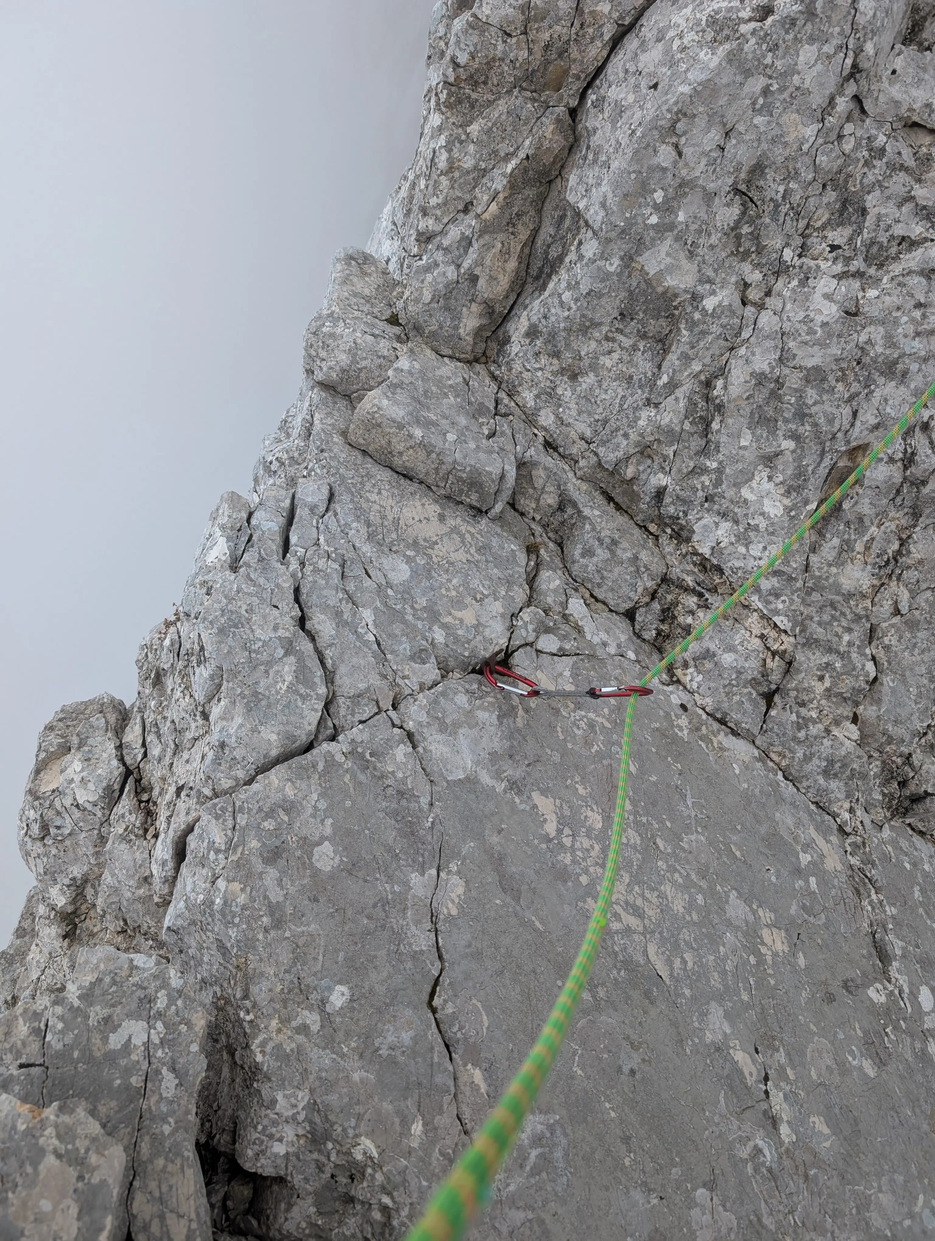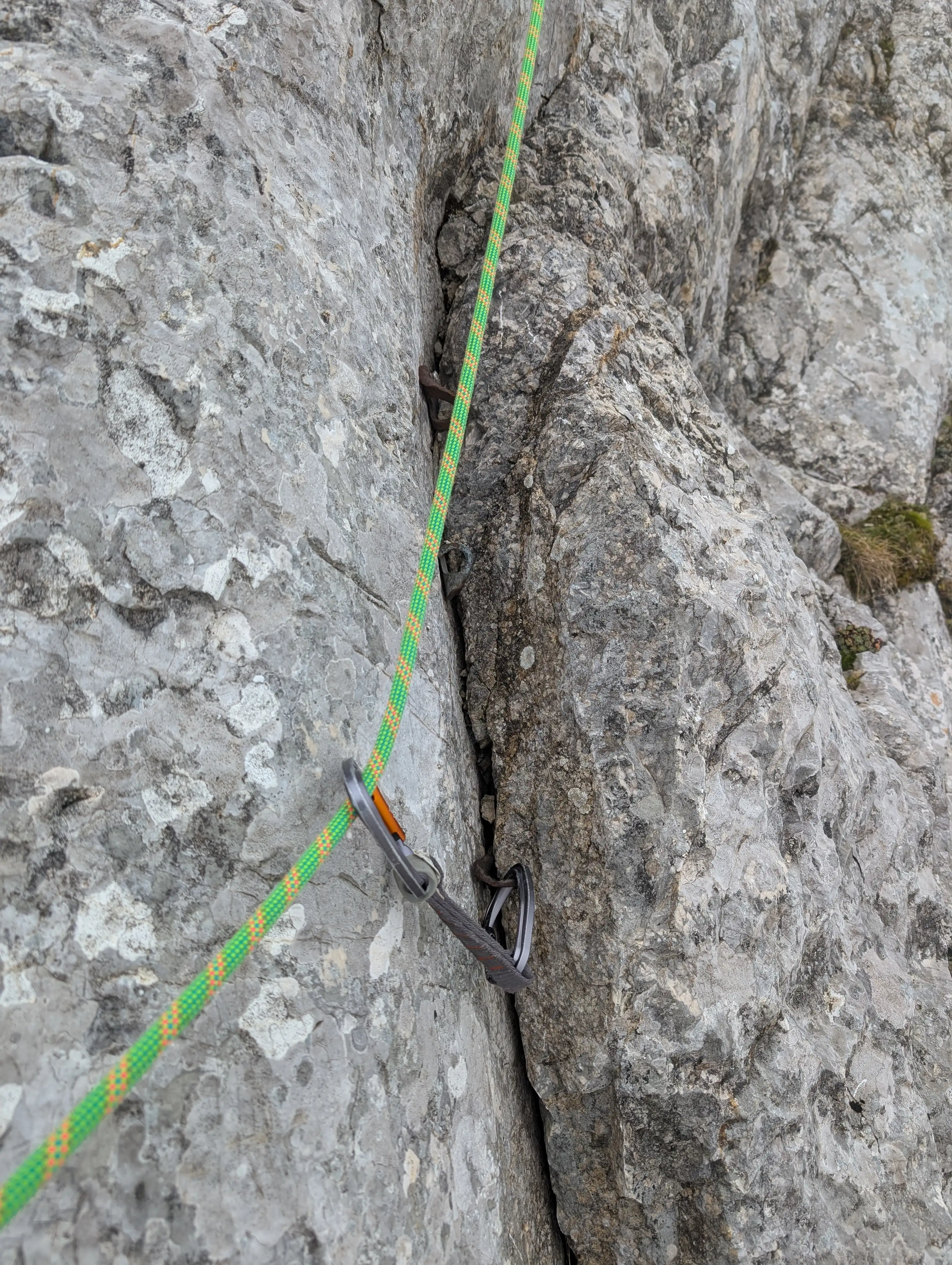 Route is only equipped with pittons, some of them are in bad condition. The rock doesn't offer that many options for mobile protection however some friends, nuts and loops come in handy. Key sections are always secured with pitons. Orientation is fairly easy. Despite low grade the route requires very precise footwork at times and because of that it might be worth to put on climbing shoes, at least for the first three pitches. Steps in there are tiny in places.