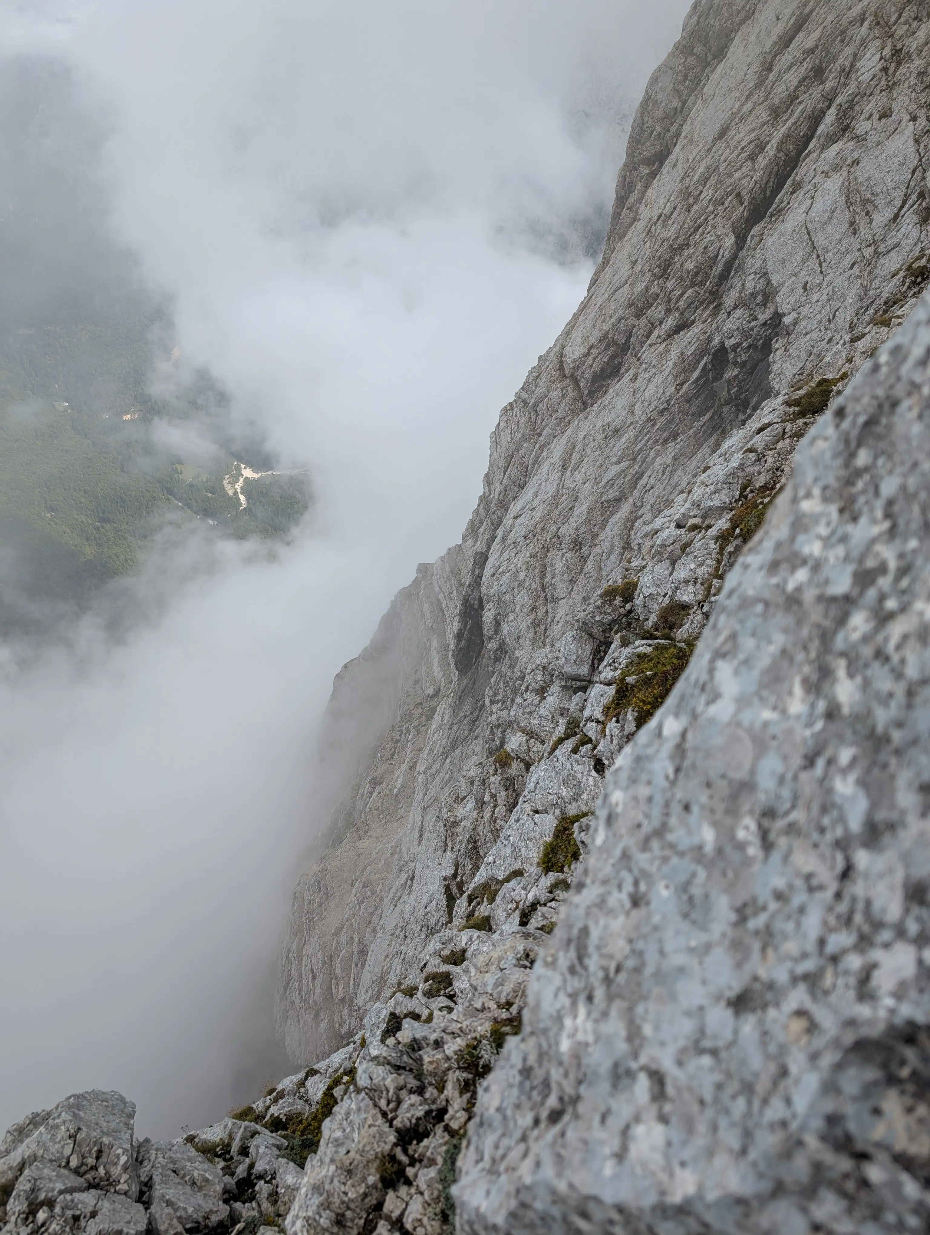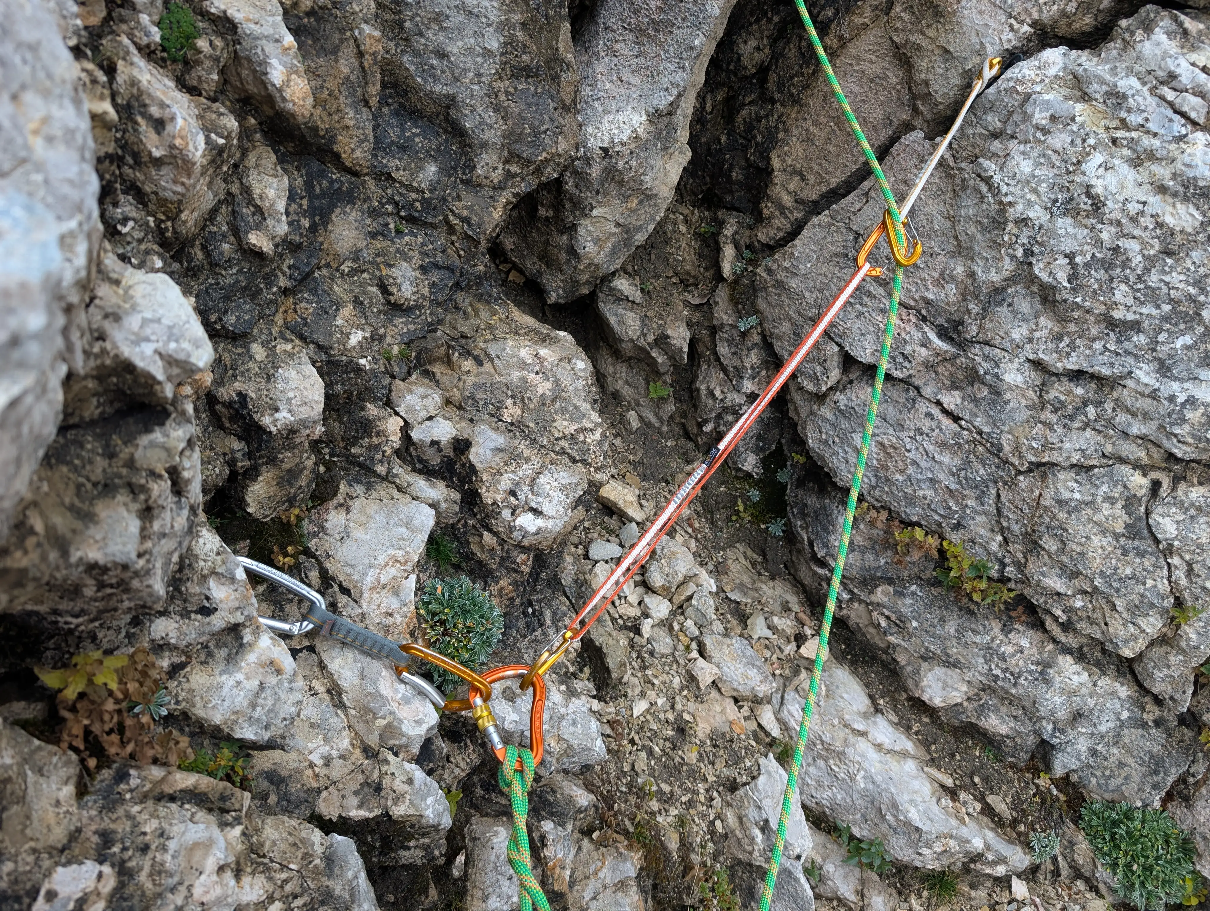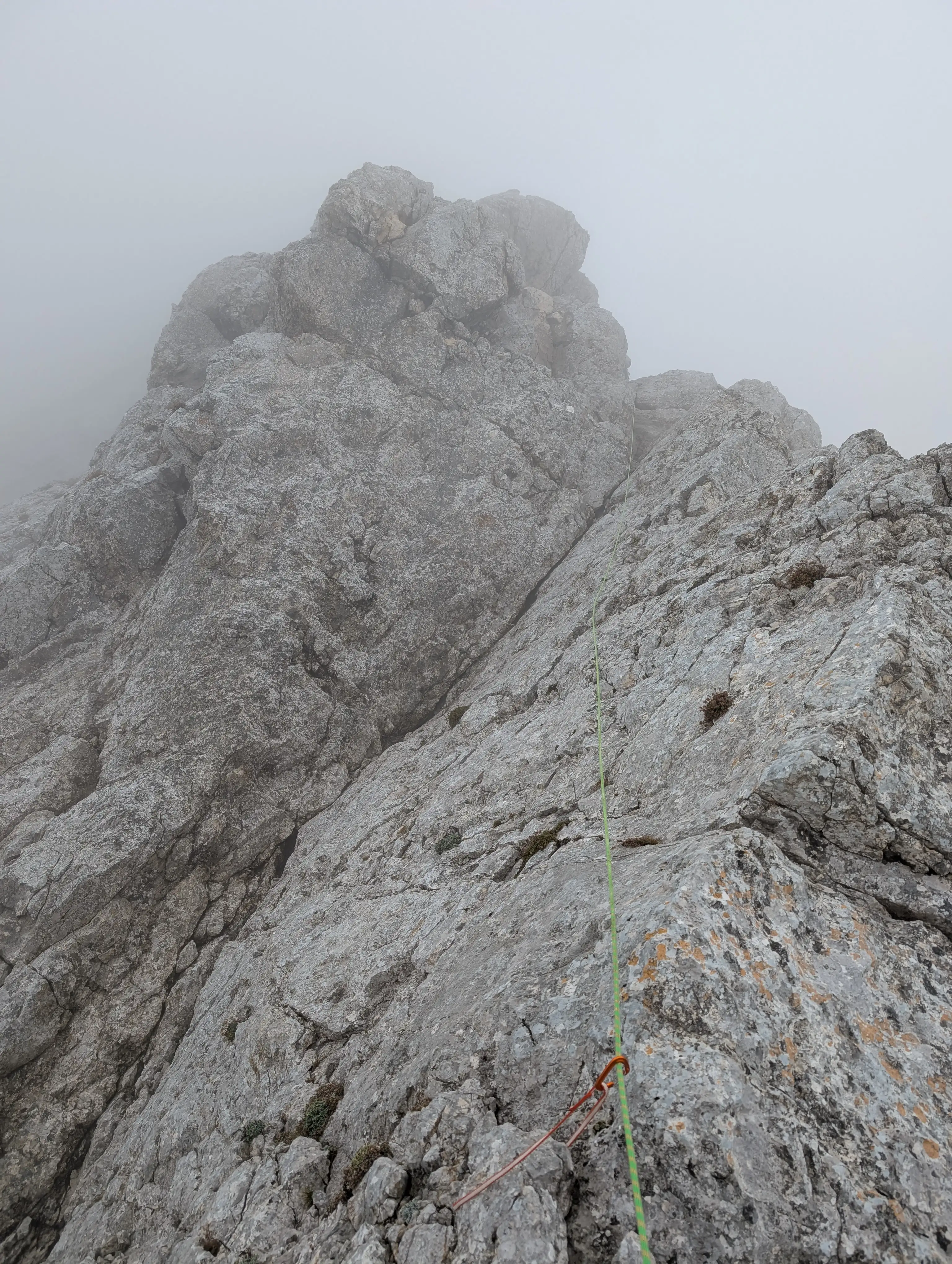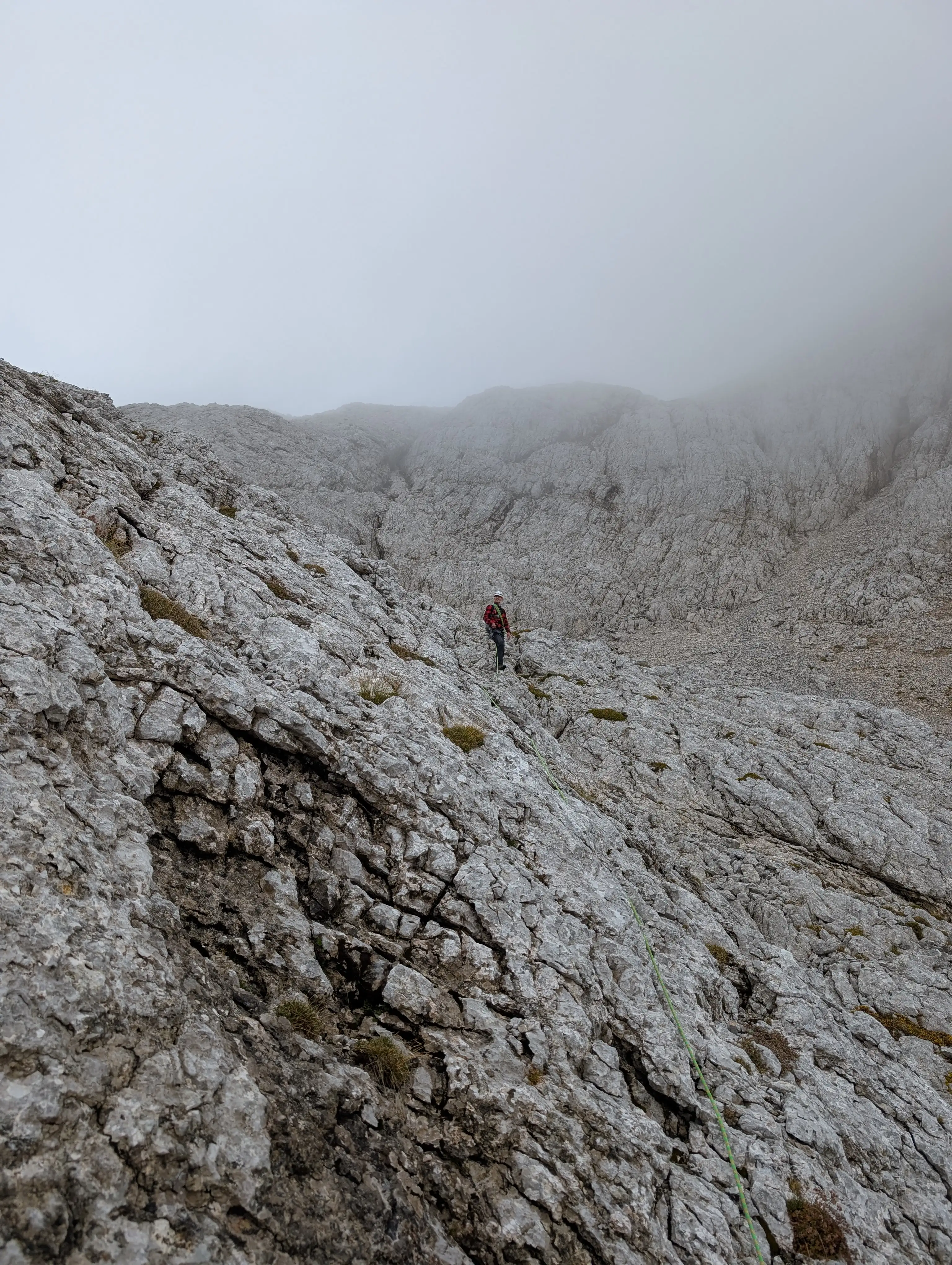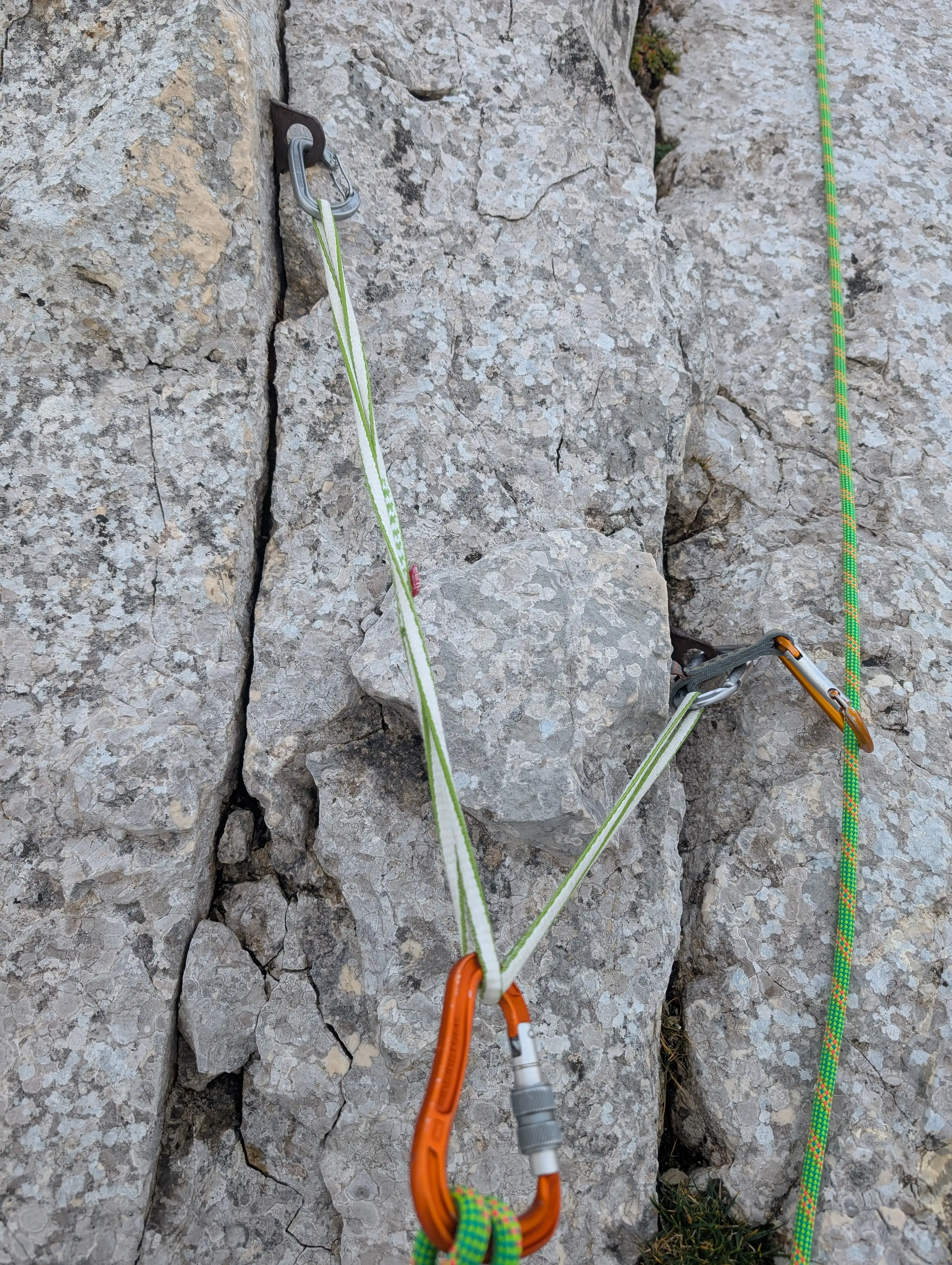 Route is only equipped with pittons, some of them are in bad condition. The rock doesn't offer that many options for mobile protection however some friends, nuts and loops come in handy. Key sections are always secured with pitons. Orientation is fairly easy. Despite low grade the route requires very precise footwork at times and because of that it might be worth to put on climbing shoes, at least for the first three pitches. Steps in there are tiny in places.