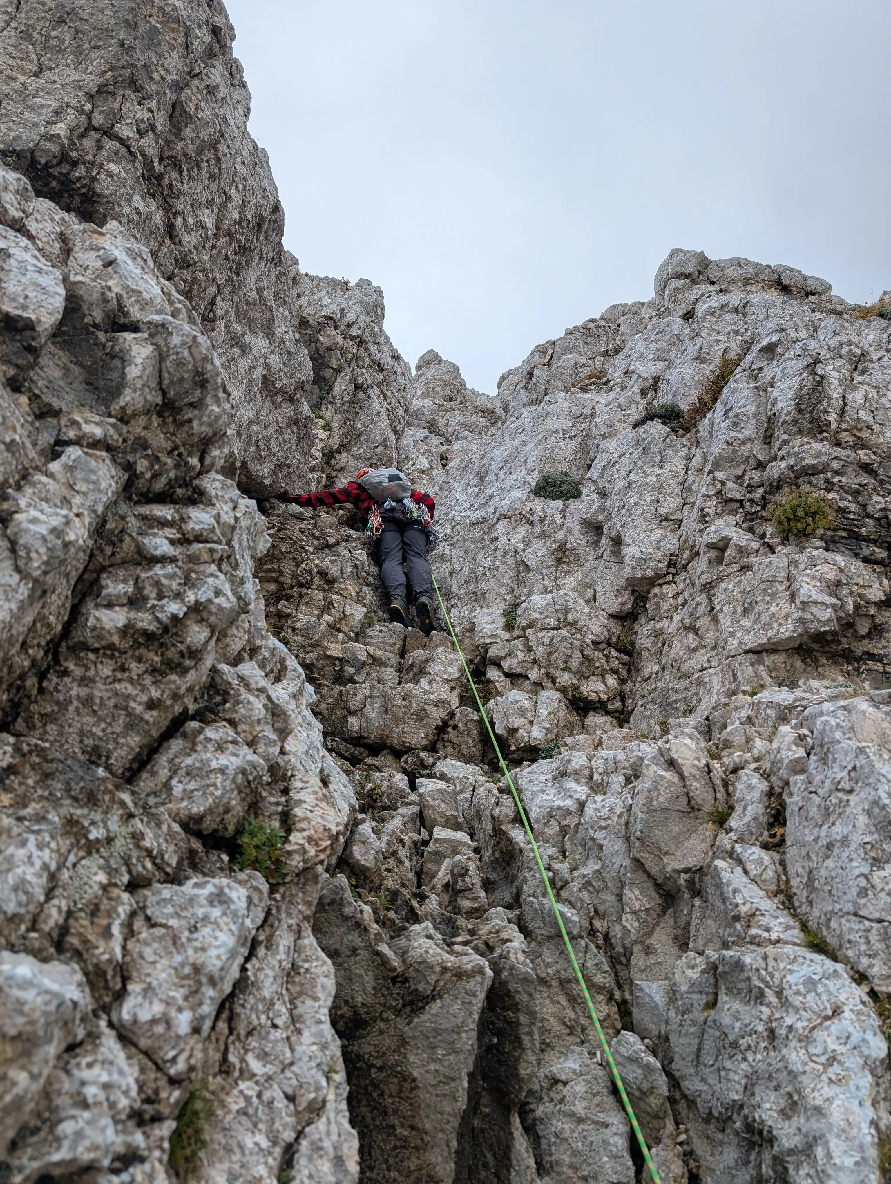 Since the rock quality is an actual concern in here extra caution is required while climbing. It's highly unlikely to meet here other teams, however, in such case I would strongly advise against proceeding in the chimney part. The risk of triggering rocks (and really big ones) even involuntarily is too high in my opinion.