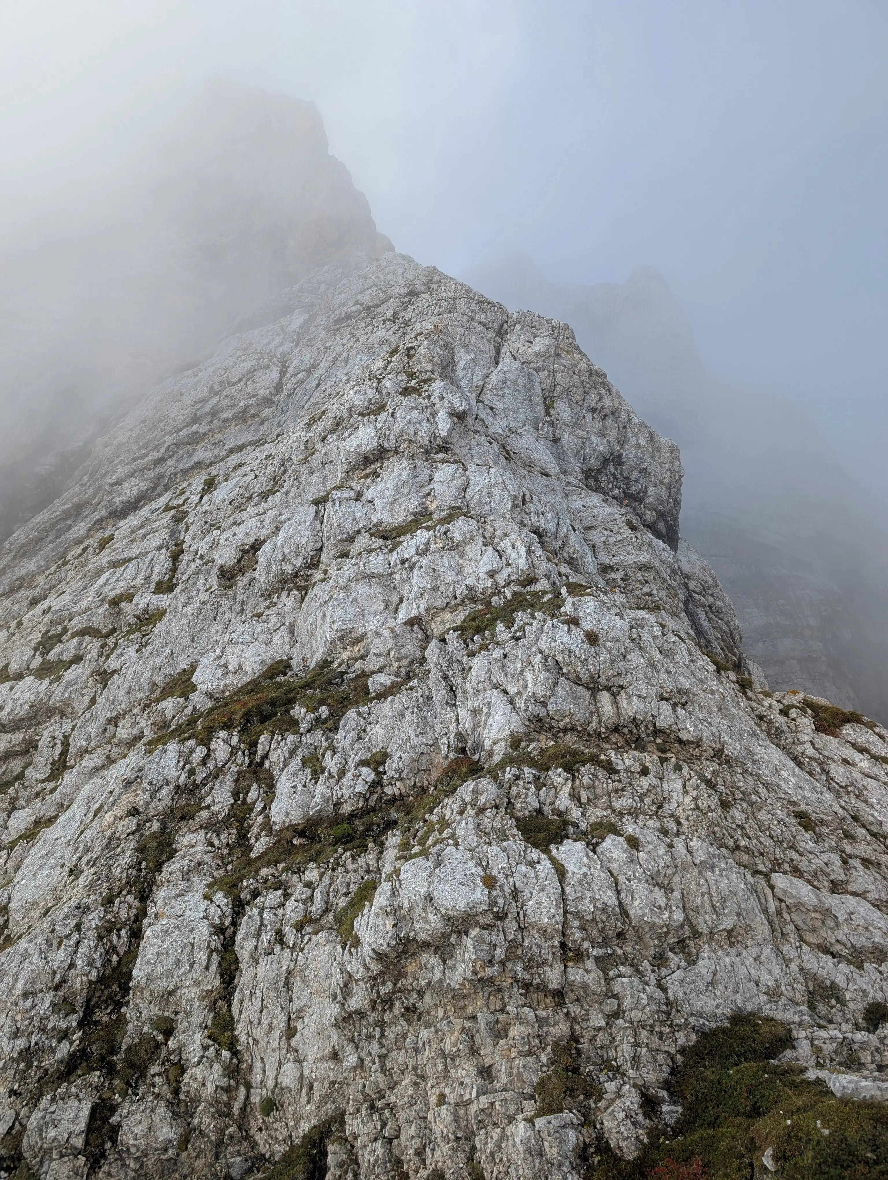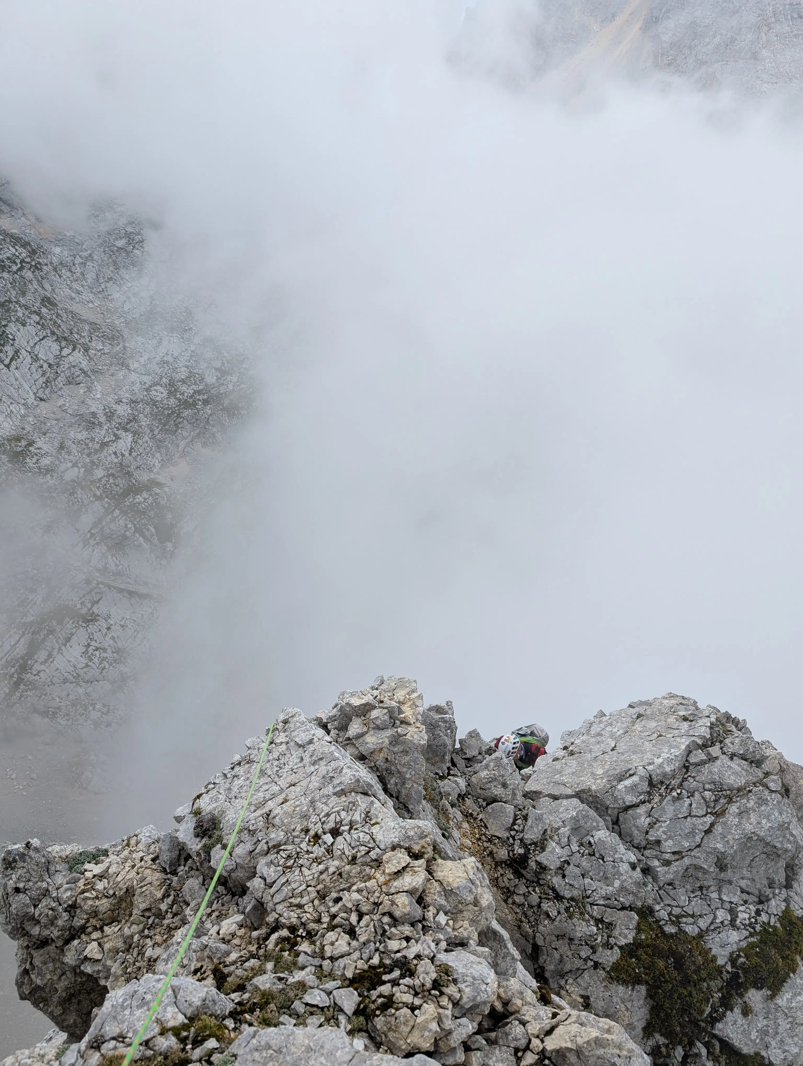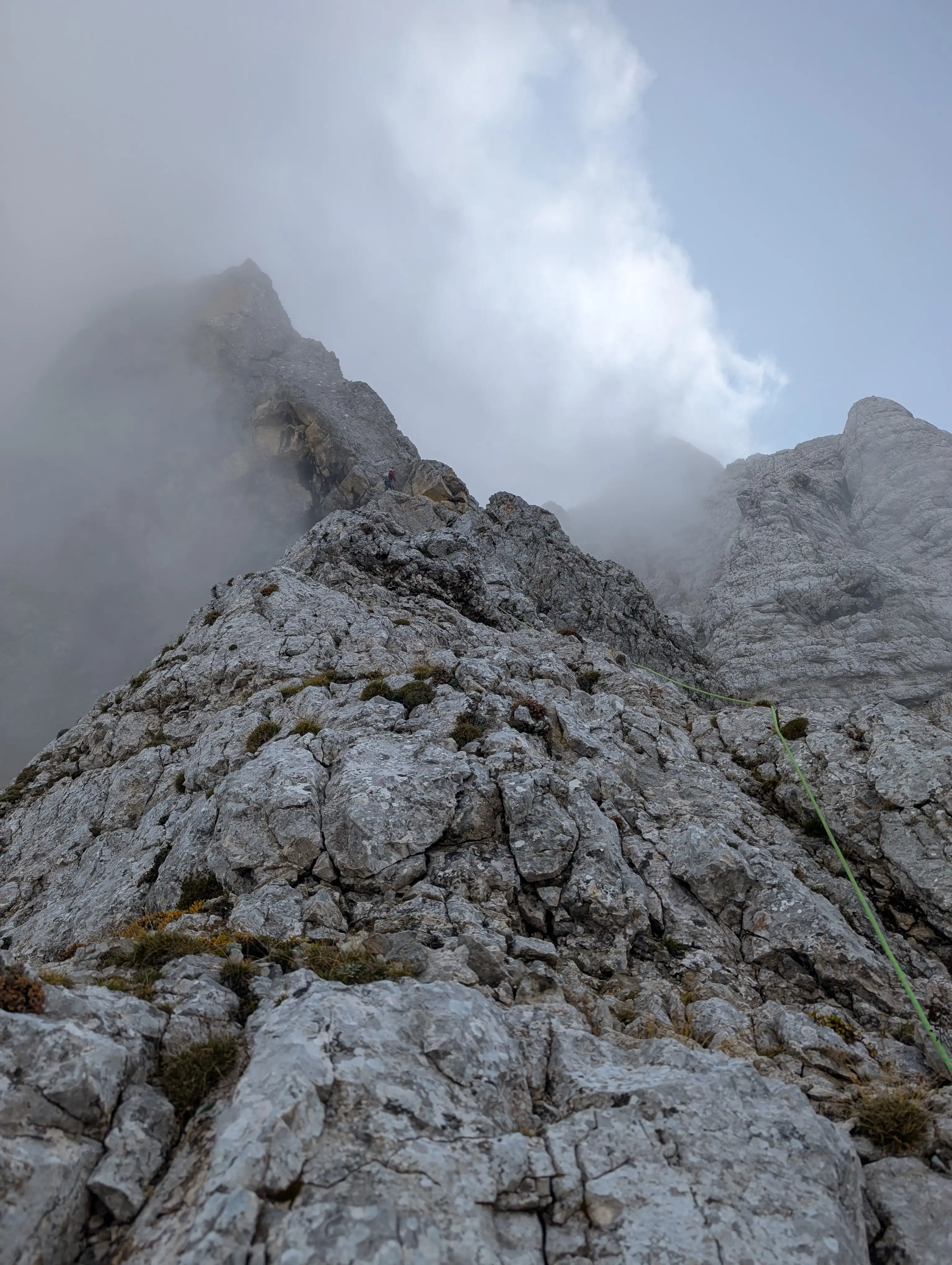 Stuffy and warm in the morning, the climb was done in low-hanging clouds with chilly feeling. Merino underwear with long sleeve was needed together with a second layer.