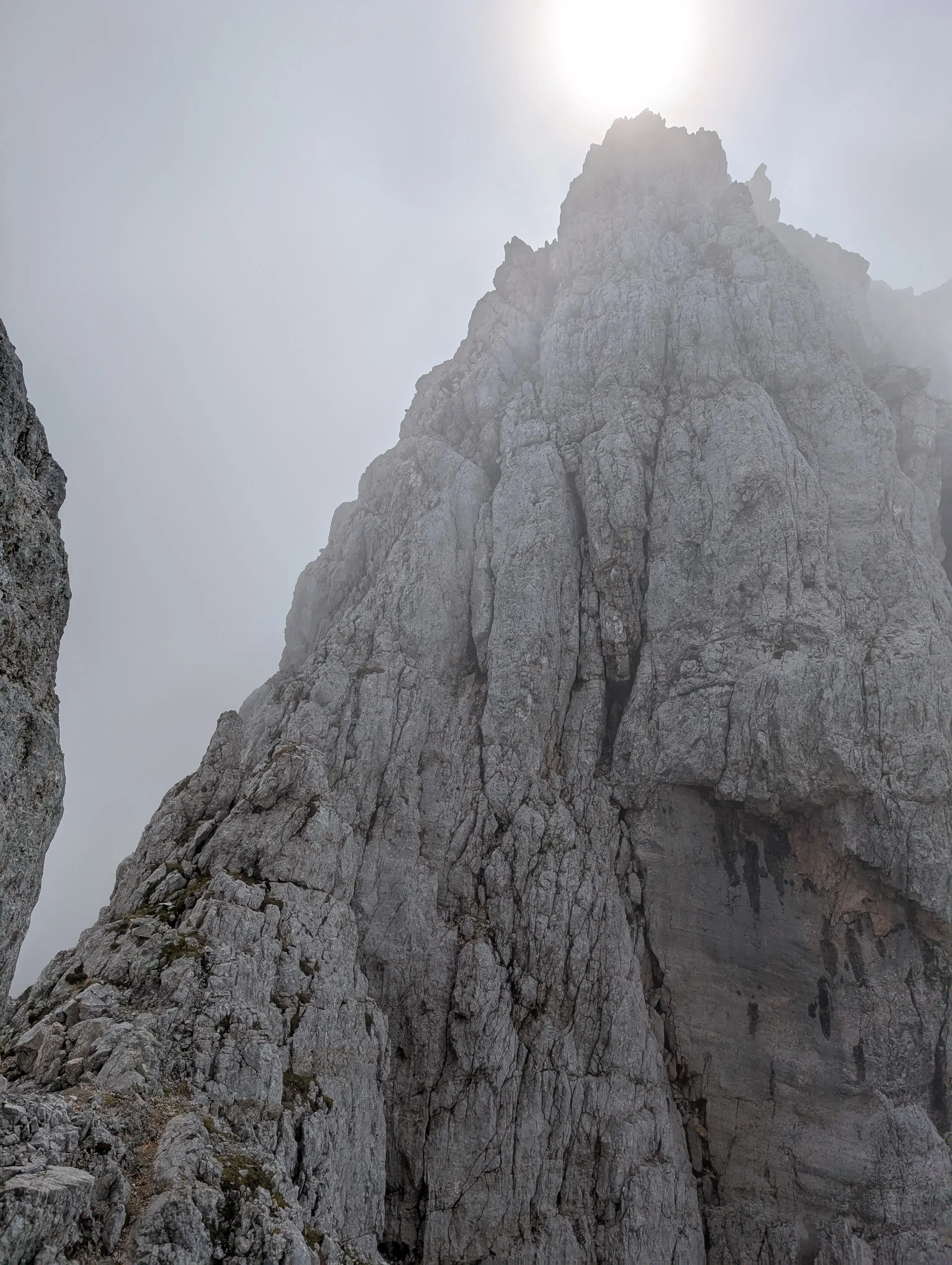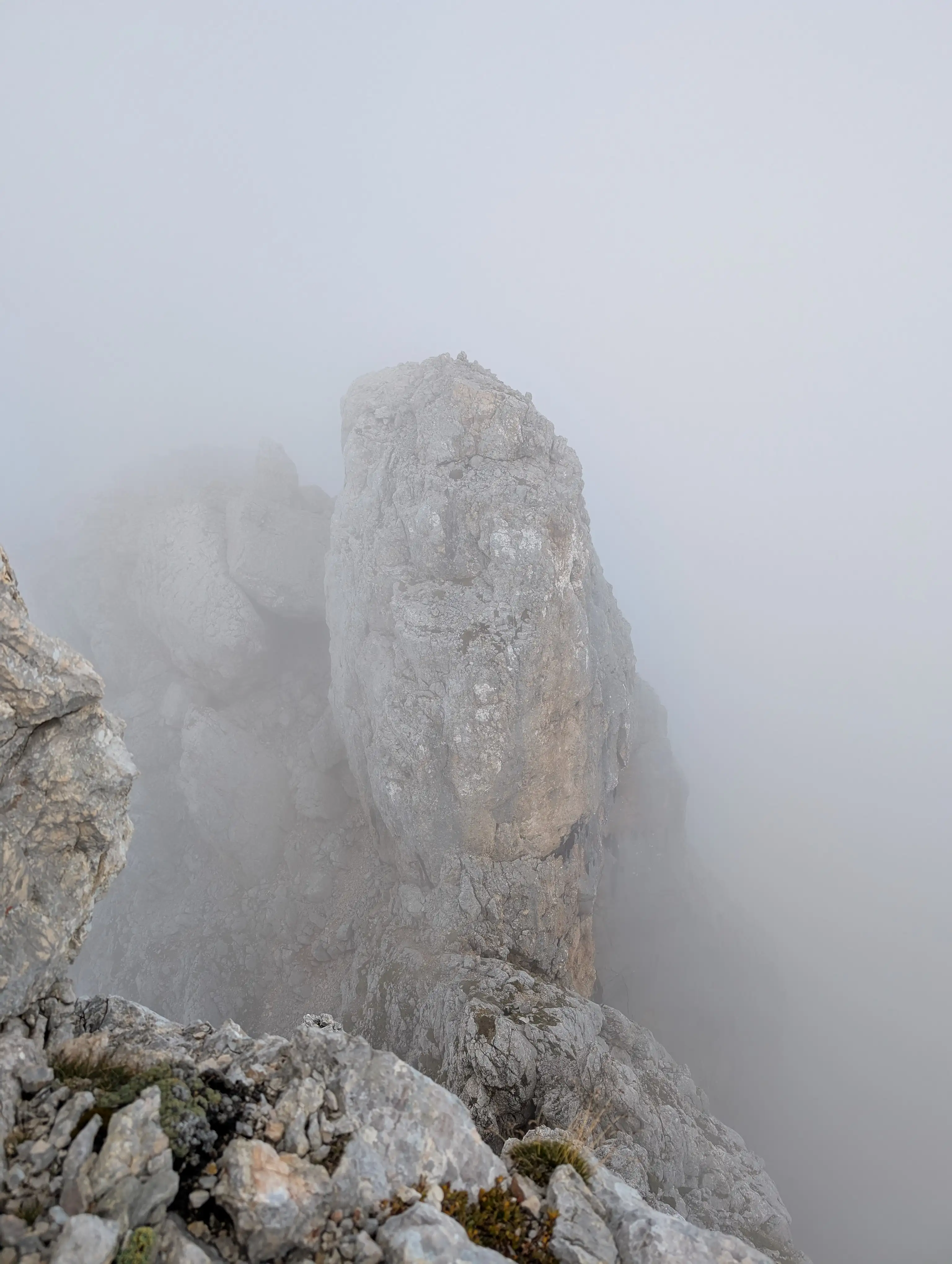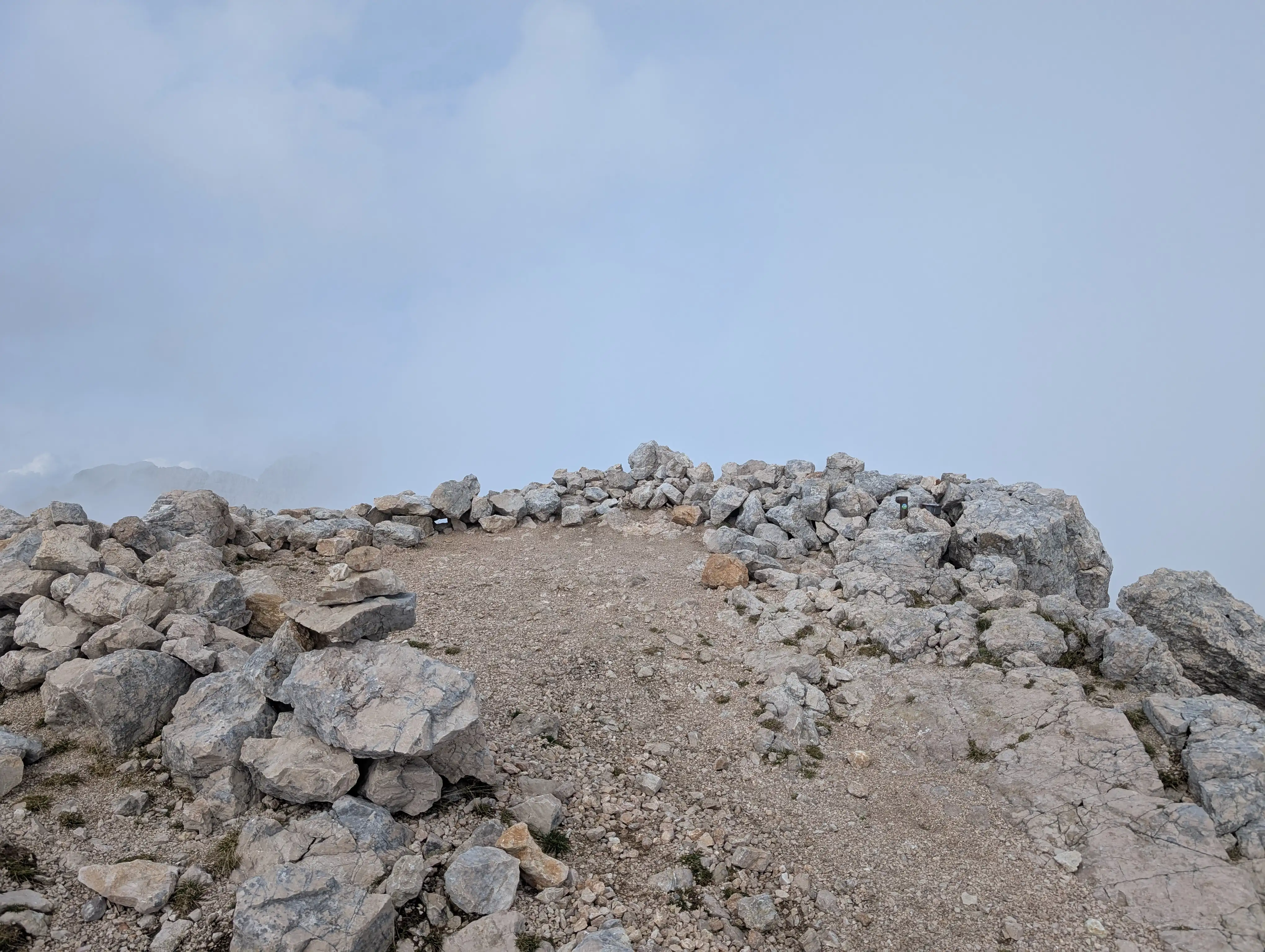 Stuffy and warm in the morning, the climb was done in low-hanging clouds with chilly feeling. Merino underwear with long sleeve was needed together with a second layer.