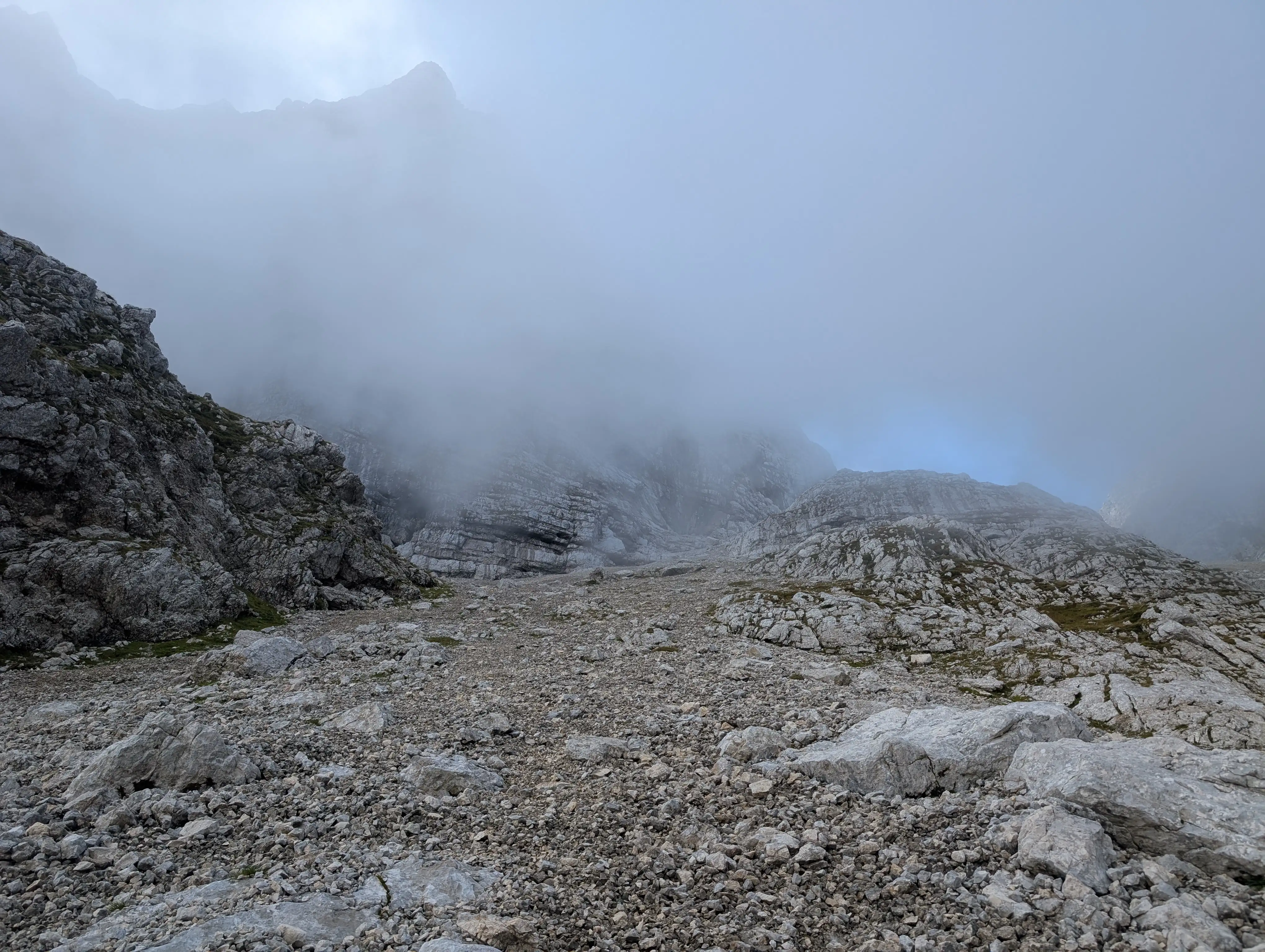 Another option to start the route really early is to spend a night at Bivak IV na Rušju shelter - it's the closest spot to the start of the route and it splits the effort into two days. Downside is we need a bit more stuff to carry - own sleeping bag and water reserve. We might also not get the best of sleep as the shelter is a popular one. (Cheers to Czechs!) Our things do not have to be carried up as long as we return via Grunt scree - we can stash our things somewhere between the rocks and don't need to return to the shelter to pick them up.