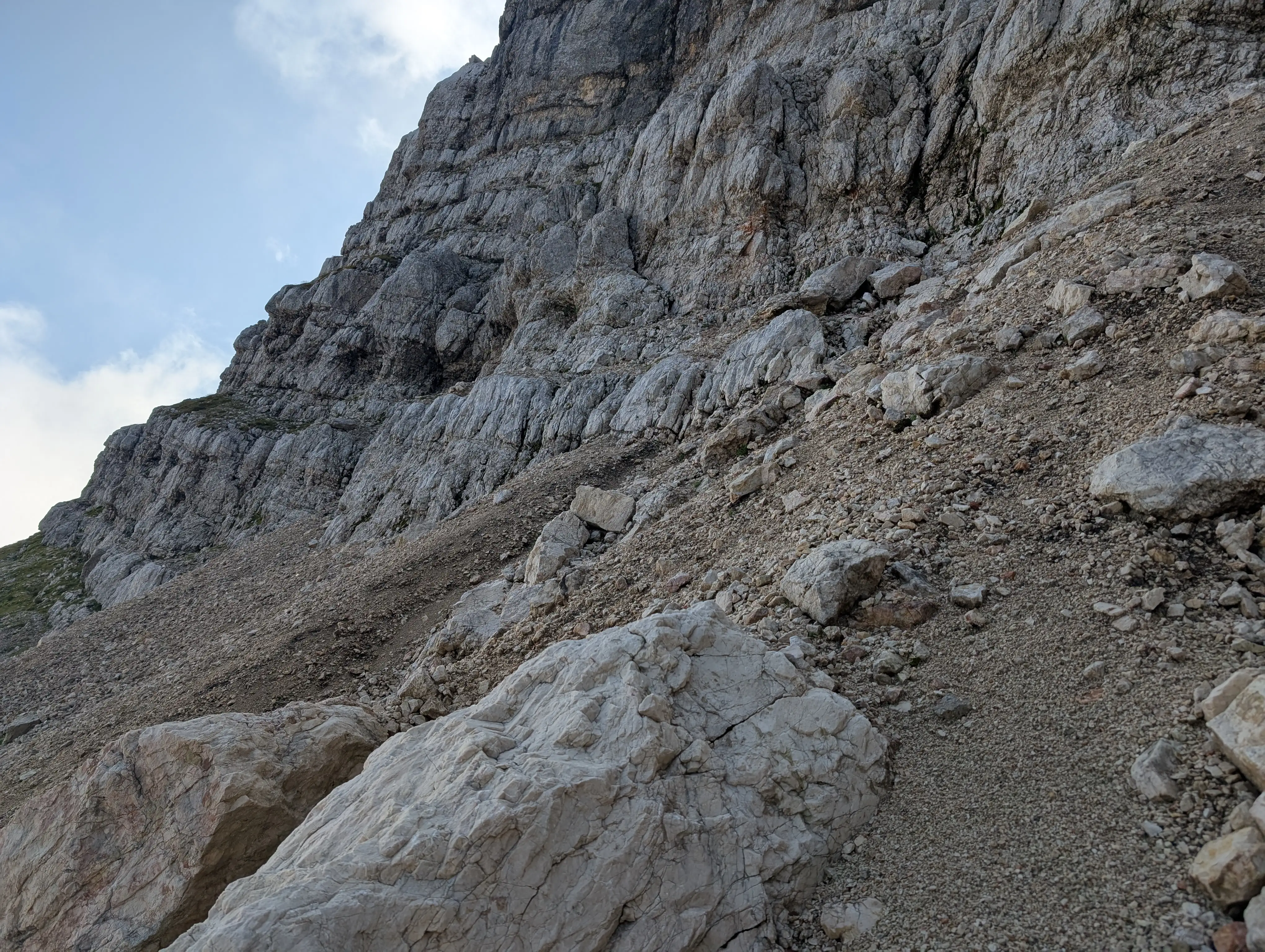 Starting from parking lot we head in the direction Aljažev dom mountain hut and shortly before it we turn right into the trail that goes to Škrlatica. Now the fun part begins as the path is quite steep and exposed to first rays of morning sun. At around 1800 meters we need be watchful as the marked path turns right but we stay in the big scree ravine and continue up. Around 1950 we turn left into scree opening that gives access to enclosed platform. Here we continue more to the left into direction where this platform is limited by sharp and exposed cliffs. Check out the images for better reference.
